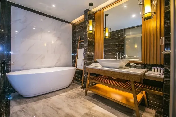 50㎡山景房、配观景阳台和超大浴缸,偏中式风格的客房,蓝色地毯搭配木质家具,将中国古典儒雅融入现代时尚,落地窗更是将视野延伸开来。