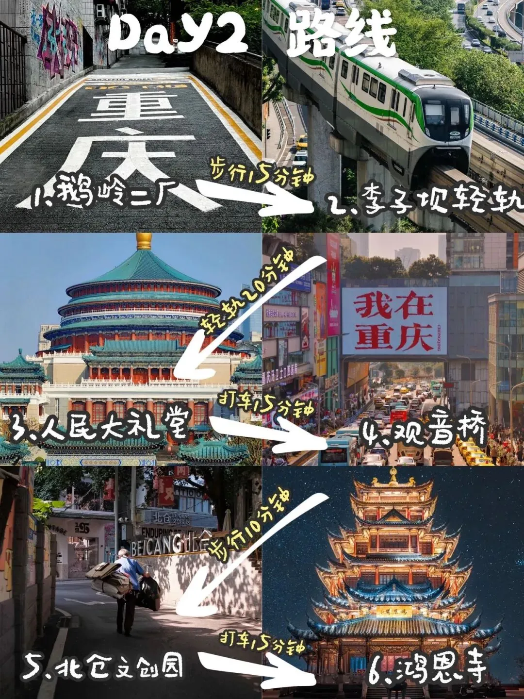 从解放碑步行几分钟就能到山城步道,走在依山而建的步道上,脚下是青石板路,身边是老重庆的吊脚楼,沿途能看到老重庆的市井生活,累了就坐在路边的石凳上歇歇脚,吹吹江风,氛围感拉满。逛完山城步道,直奔十八梯,这里是老重庆和新重庆的衔接处,下半城的老巷弄藏着最地道的山城味道,路边的小面店可以尝一碗,麻辣鲜香,人均10元吃到撑。 接着去白象居,这是重庆最具特色的居民楼,24层没有电梯,却藏着超美的江景,这里也是众多影视剧的取景地,站在观景台能看到长江索道穿楼而过,随手一拍都是氛围感大片,注意不要打扰居民的正常生活。逛完白象居,步行到来福士广场,在江边的观景台看看两江交汇的美景,感受重庆的现代繁华,和对面的洪崖洞遥遥相望,打卡拍照超出片。 最后一站就是洪崖洞,重点来了!本地人真心建议,洪崖洞只需要在外面的江边或者千厮门大桥上看夜景就好,千万不要进去!内部就是层层叠叠的网红小吃店和纪念品店,价格贵还没特色,每层的布局都大同小异,进去之后人挤人,体验感极差,白浪费时间和精力,晚上亮灯后的洪崖洞,从外面看就像现实版的千与千寻,拍照打卡就足够了。 第二天主打文艺休闲风,从鹅岭二厂的复古文艺,到李子坝的网红穿楼,再到观音桥的人间烟火,感受重庆的多面魅力。第一站鹅岭二厂,这里是由老印刷厂改造的文创园,保留着老重庆的工业风,斑驳的墙壁、复古的机器,搭配各种文艺小店,随便走走都能发现惊喜,站在二厂的观景台,能俯瞰整个重庆的城市风光,傍晚来这里看日落,氛围感直接拉满。