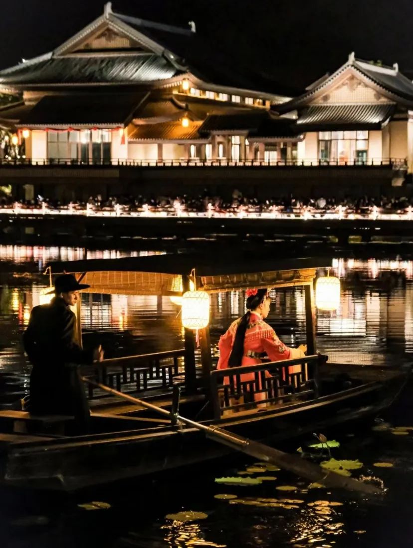 图源小红书@24号夜游问梅村怎么能少的了灯光秀和表演,湖上泛舟弹凑一首琵琶曲,带你穿越回大唐盛世。