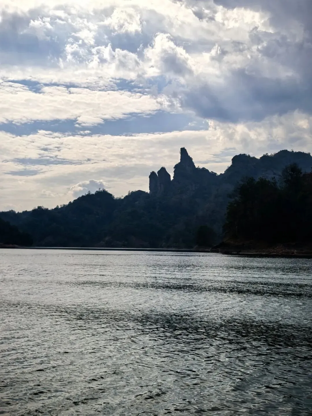船行至侧面,三座山峰仿佛被天斧劈开,化作直插云霄的三把利剑,因此得名“三剑峰”。