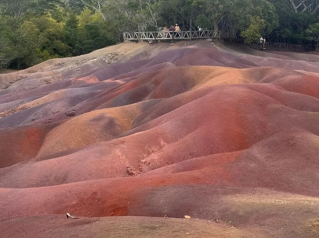 (1)七色土(Chamarel 7 Coloured Earth Geopark)是毛里求斯查马雷尔高原上的特殊地质景观,位于Chamarel村附近的山谷中。该地貌由火山喷发后灰烬经氧化及侵蚀作用形成,呈现赤橙黄绿青蓝紫七种颜色分层交错的景象,表层因腐蚀形成波浪状山丘,在阳光折射下呈现斑斓光泽,被称为“地上彩虹”或“天然调色板”。其彩色土壤面积约东西长50米、南北宽百余米,不同颜色土壤混合后可自动分层复原。