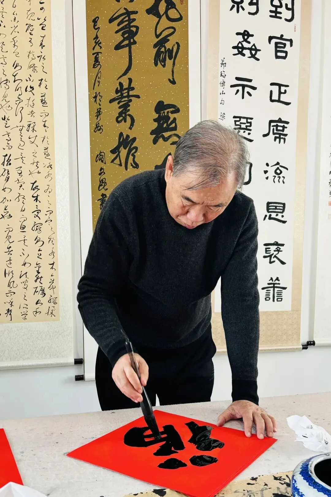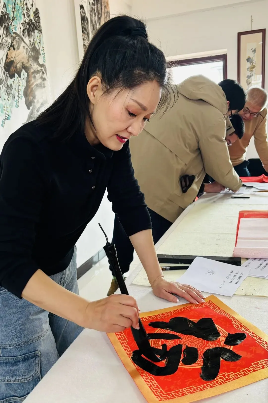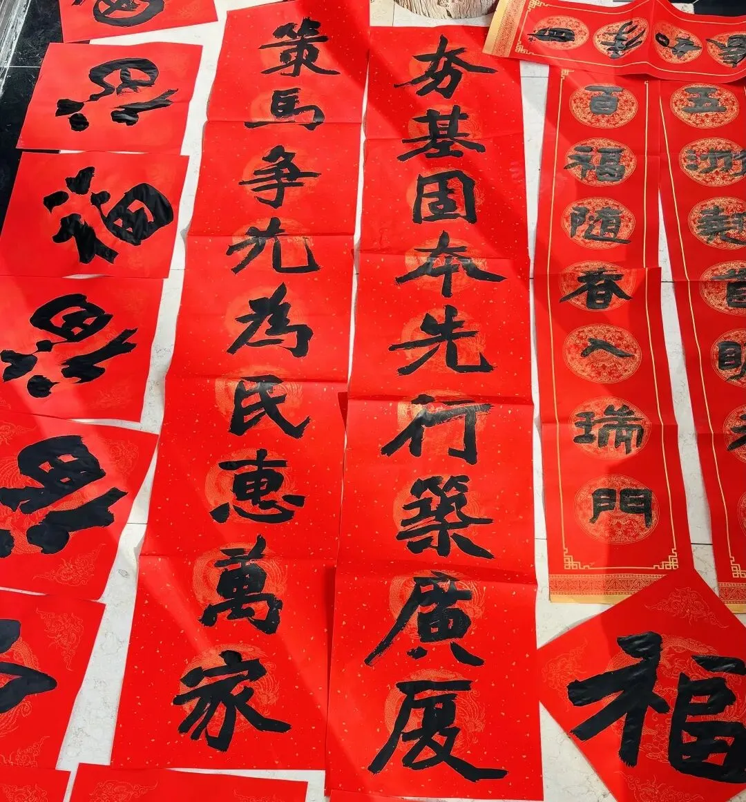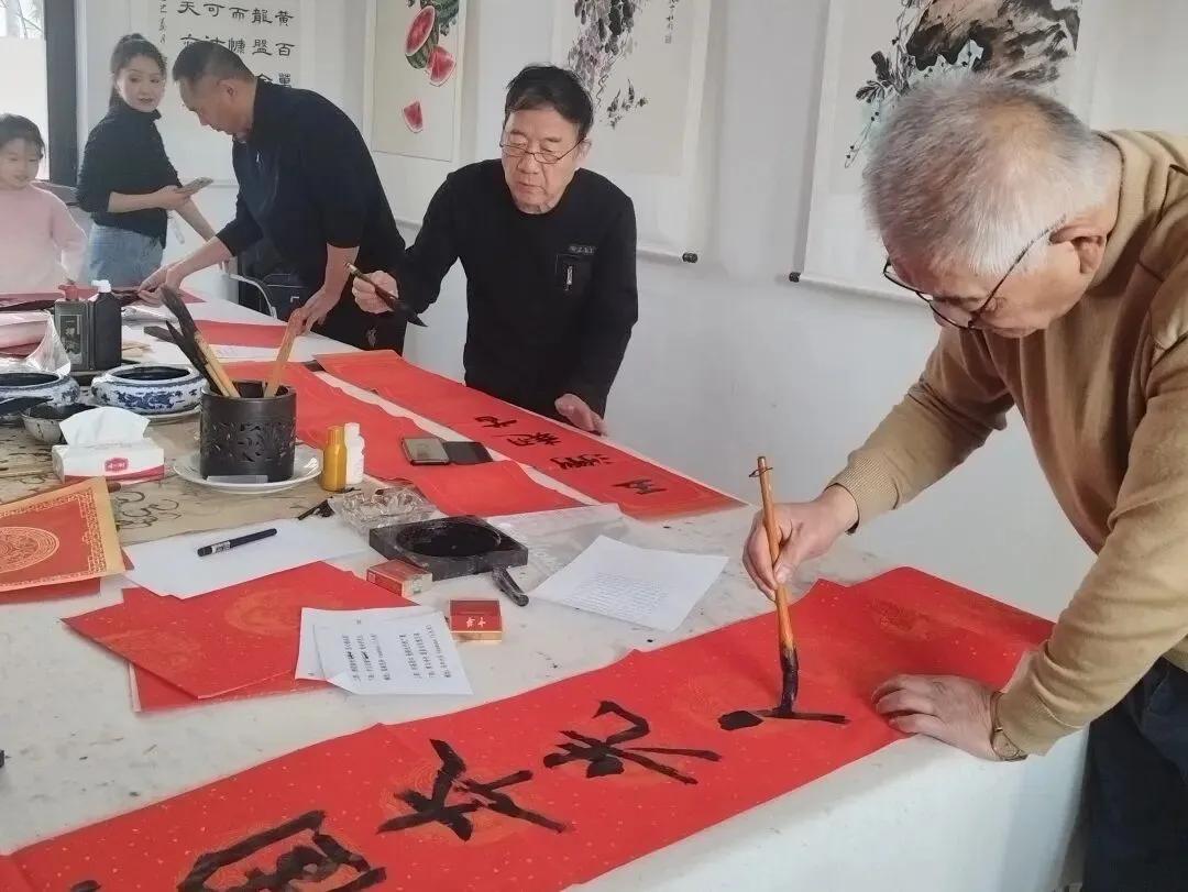 案头红纸列阵,砚中浓墨飘香,众人依次挥毫,以笔墨为媒、以对联为载体,书写新春吉庆,尽显翰墨风雅。