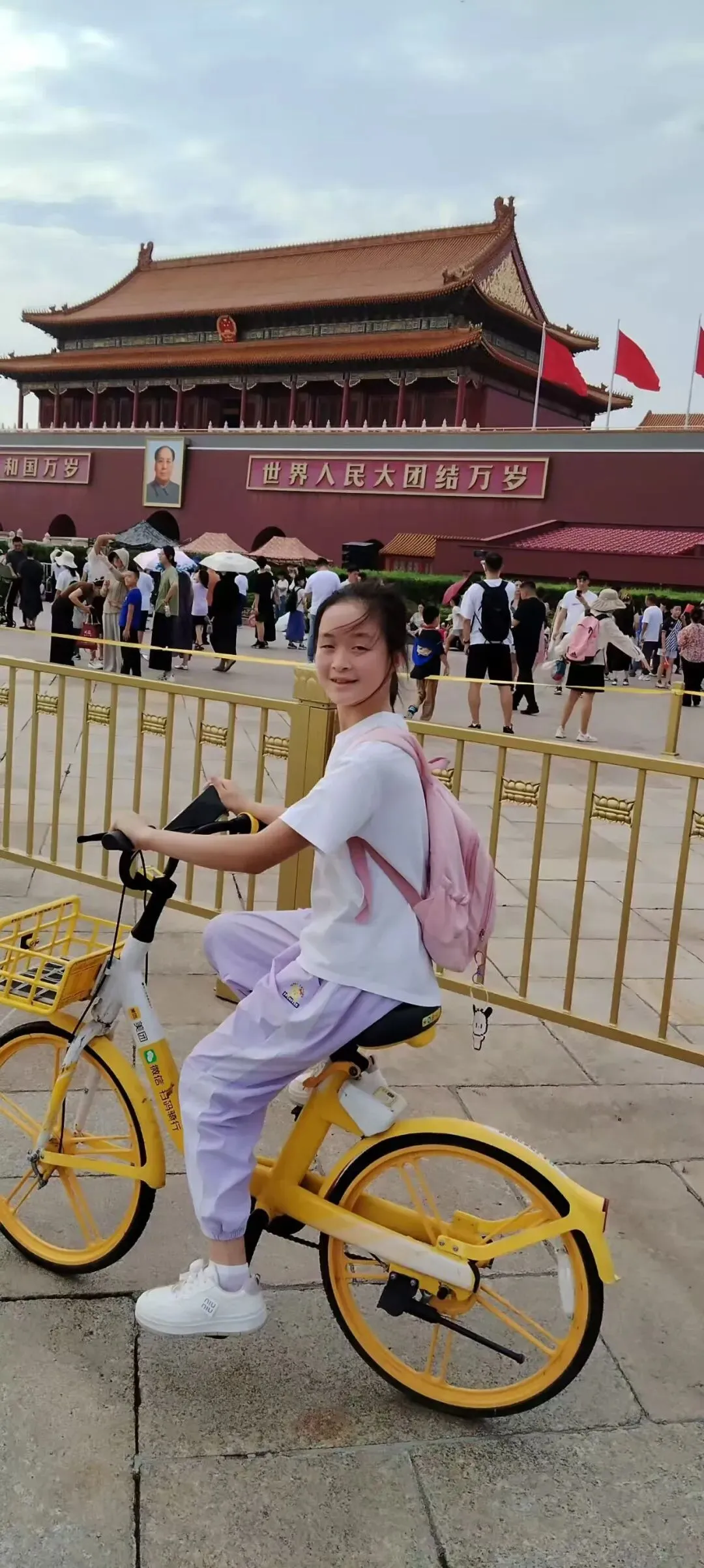 中午不忘去酒店旁边巷子里的饺子馆去吃美味的饺子、卤牛肉牛蹄,偷听老北京人聊天。 下午两人打的去下一站王府井南京大饭店的路上兴奋地把手机掉在了出租车上,到酒店办手续时才发觉。报警等一系列操作下来三点多才拿到手机,这时已经过了人民大会堂的预约时间。而且我们发现北京打的会堵车,没有骑共享单车和地铁来得方便,于是母女俩骑着单车在北京胡同里狂炫车技。北京的马路对自行车挺友好,电瓶车几乎看不到,汽车又很注意礼让行人。骑着自行车可以张望北京的风土人情,看到有意思的店就停下来看看、买买、尝尝,非常惬意。言归正传,五点多我们来到天安门的附近,长安街上警察叔叔特别多,每隔一段距离就会查身份证,到天安门地铁口就不准前行了,但是自行车是可以骑车过去的。我们好不容易找到了两辆自行车(原来的自行车停在店门口被人家抢扫去了)。骑着小车在长安街上吹着小风看到了心心念念的北京天安门,好开心呀!