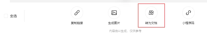 在生成的表格下方点击“分享”,建议选择“转为文档”,点击后,跳出提示“已为您保存为腾讯文档”字样,点击“打开”-“文档操作”,可以考虑导出为PDF。因为导出图片,需要会员功能,而且表格太长太大,无法显示全部内容。