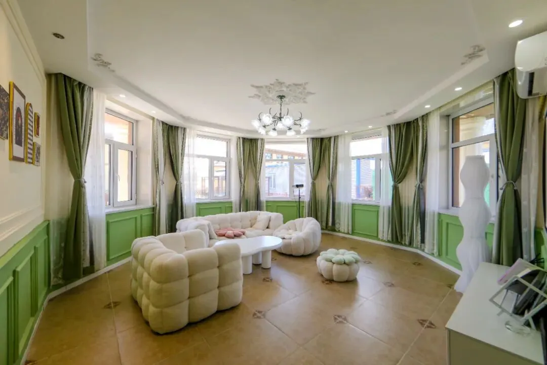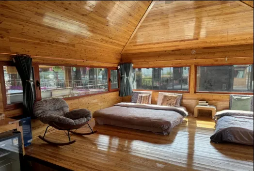 林深艺墅民宿馆位于嘉荫县红光乡燎原村,总占地面积4000平方米,拥有独立小院,由4栋独栋别墅构成,分为ABCD栋,装修风格各不相同,其中A栋为地中海风格,B栋为恐龙元素风格,可以围炉煮茶,C栋田园原木风,D栋为法式奶油风,每栋有4个大床房,均是独立卫浴且干湿分离,配备智能马桶,1个榻榻米房型(多功能室),每栋5个房间,均配备投影、空调、暖气、挂衣区,公共区域有客厅、餐厅、厨房、车库、公卫、观景台,院内配备大铁锅、烧烤等凉亭。