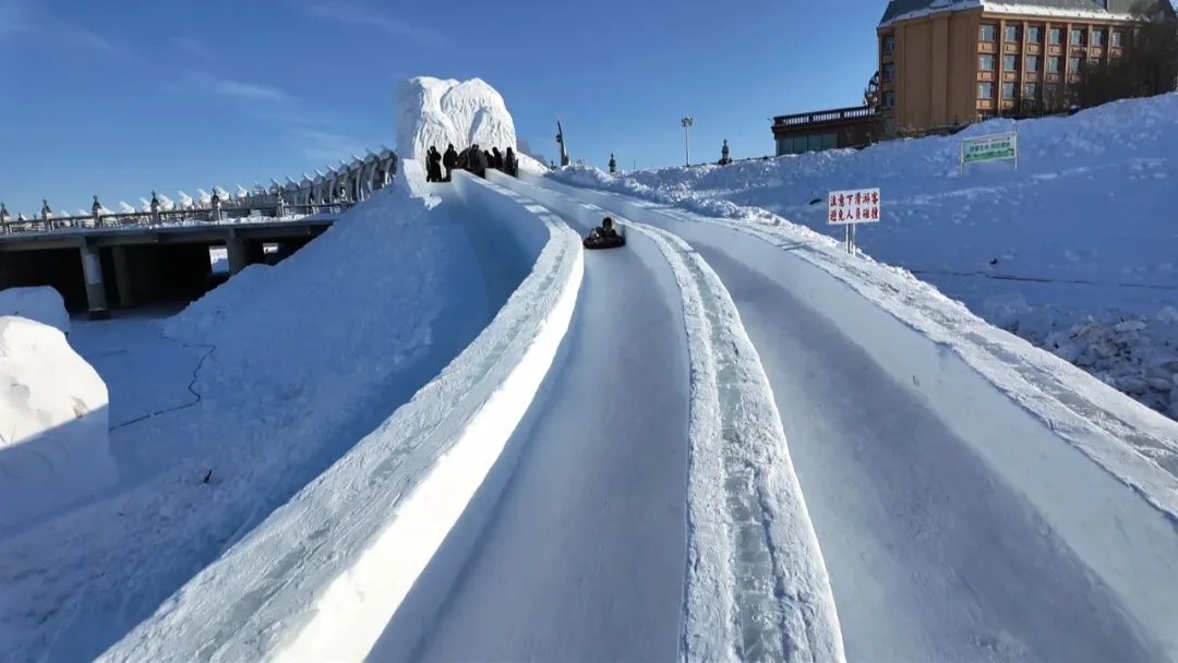 除核心滑梯项目外,冰上自行车、雪地碰碰球、雪地足球等20余项趣味活动全部向公众免费开放,覆盖全年龄段需求,真正实现“零门槛畅玩”。江畔广场上,造型各异的恐龙冰雕错落分布,再现史前巨兽风采,成为游客拍照留念的必到之处;圆润可爱的“恐龙蛋”雪屋被打造成休憩游玩空间,孩子们穿梭其间嬉戏打闹,笑声回荡在界江上空,构成一幅生动的“童趣冰雪图”。