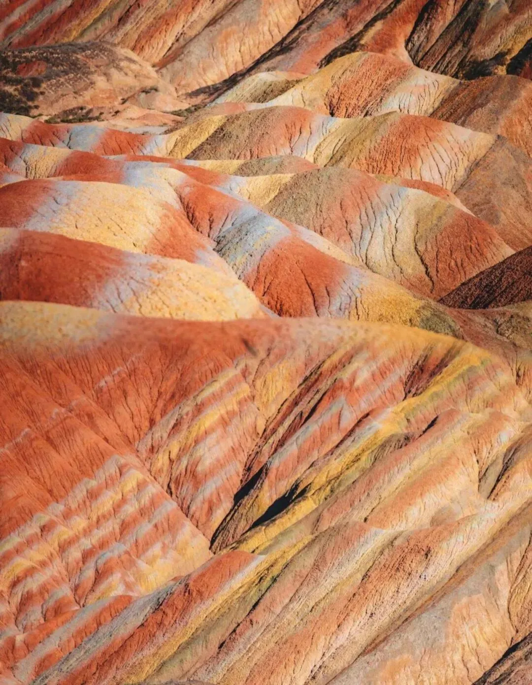 下午的.光线最好,.照在山上,红一层.、黄一层、白一层,像打翻了的矿物颜.料盘。坐景交车到四号观景.台.,.等一场日落.,颜色.会从鲜艳慢.慢沉下.去,.变成熟.透的赭石色。.风.很大,.吹得.帽子要飞.走.,.得用手紧紧按着.。