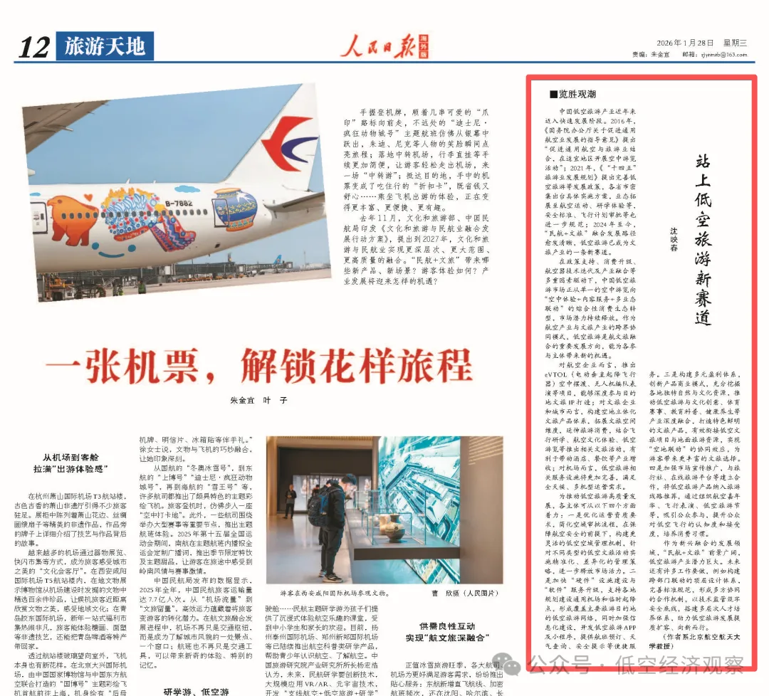 作为新兴融合的发展领域,“民航+文旅”前景广阔,低空旅游产业潜力巨大。未来还有许多工作要做,例如构建跨部门联动的顶层设计体系,完善标准规范,形成多方协同的合作机制,以技术监管筑牢安全底线,搭建多层次人才培养体系,助力低空旅游发展提质扩容、向新而行。