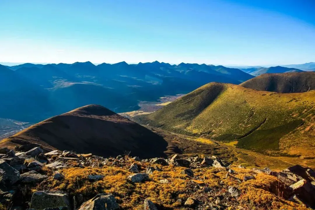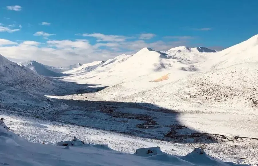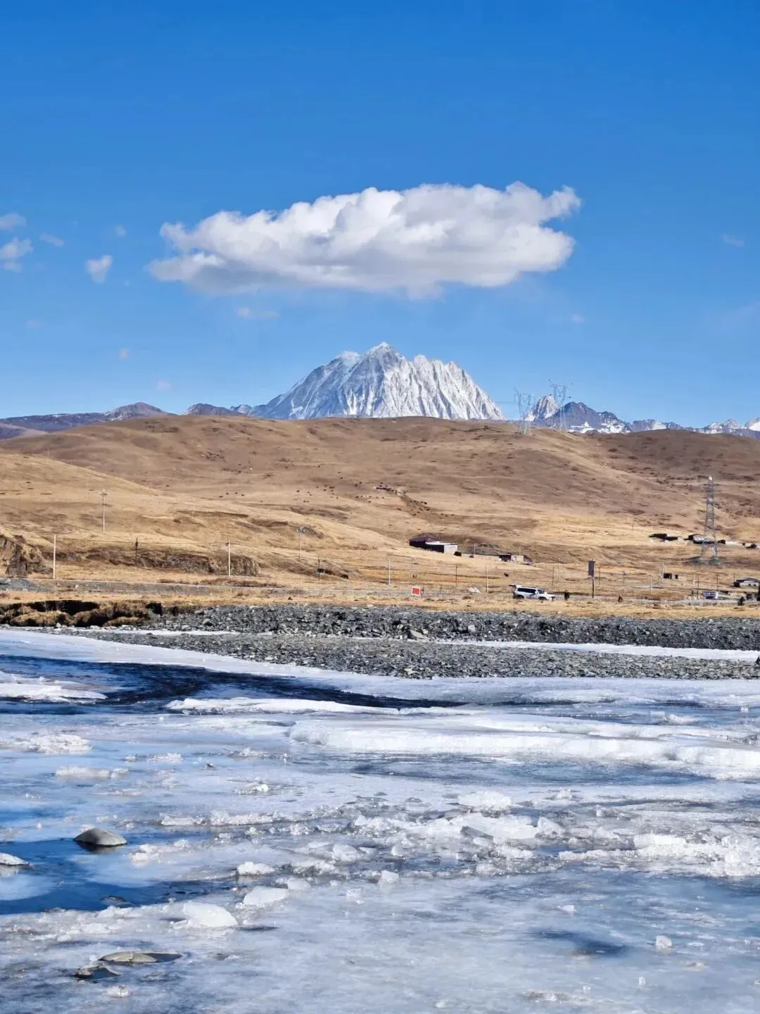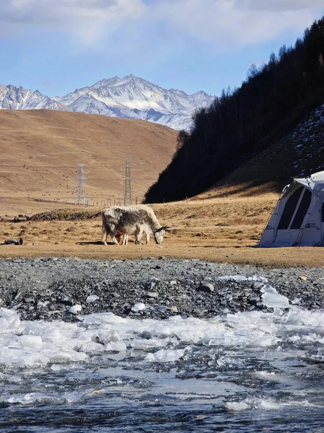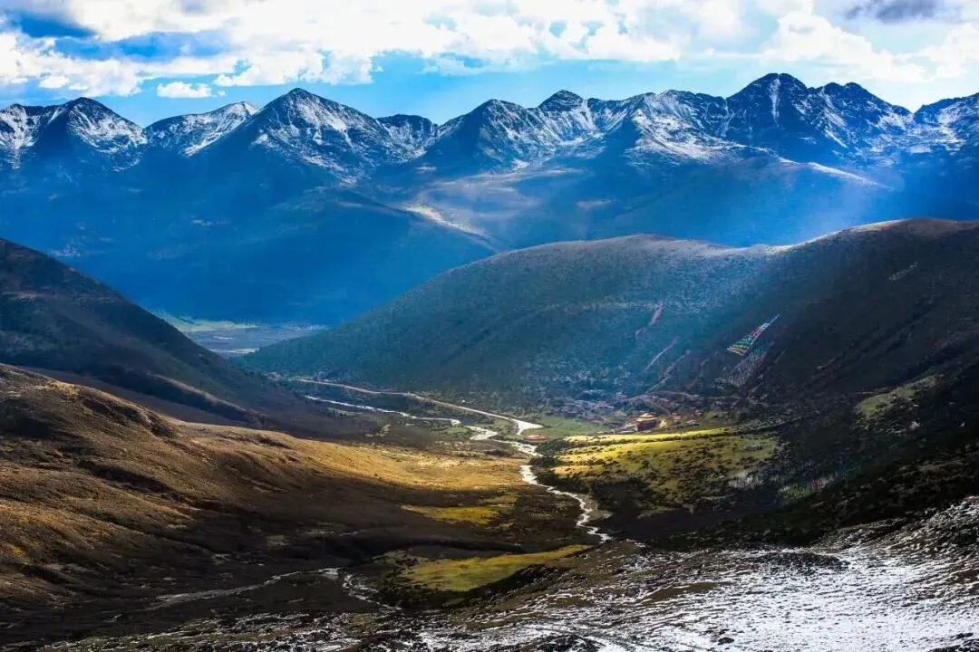 冬日里,金黄的草甸缀着零星小石子,潺潺溪水绕着矮坡打转,抬头就能望见亚拉雪山的银白峰峦。