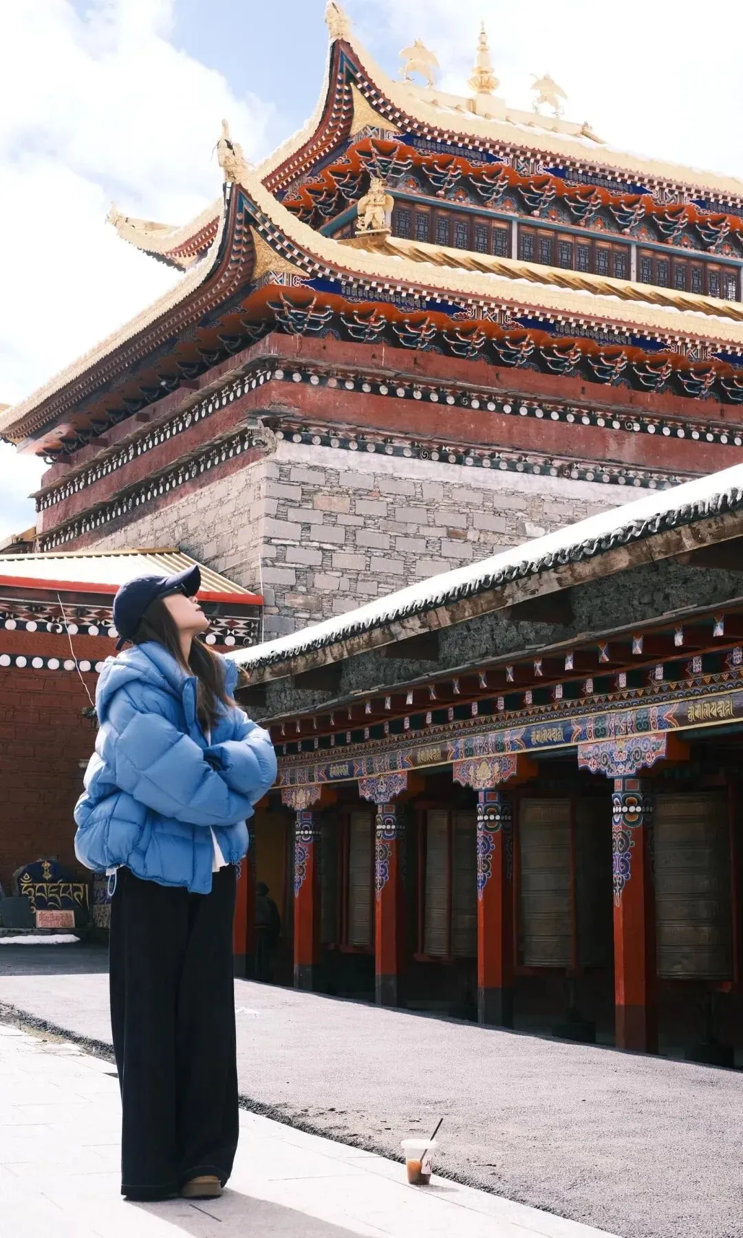 木雅大寺的金顶在晴光里愈发醒目,暖黄光泽落在雪地上,晕开柔和的光斑。