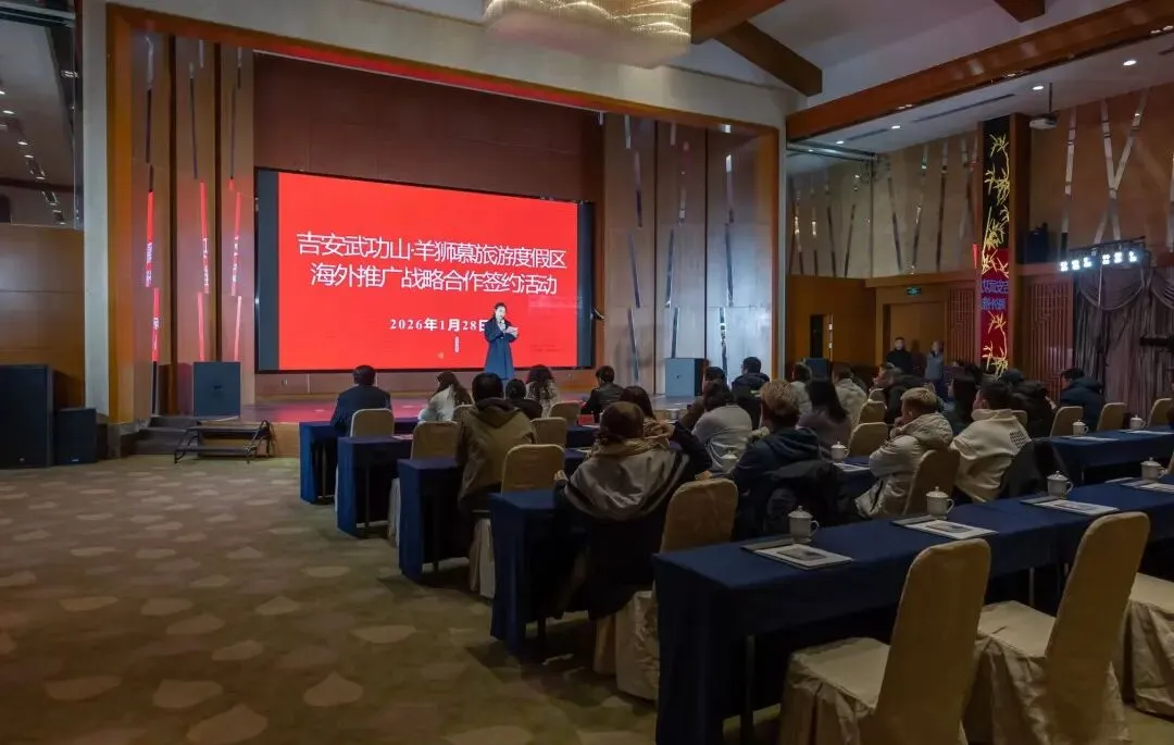 2026年1月28日傍晚,吉安武功山·羊狮慕旅游度假区海外市场推广三方战略合作签约仪式在江西武功山嵘源国际温泉度假村康年殿隆重举行。吉安武功山旅游发展集团有限公司、江西和易国际旅行社有限公司、马来西亚华人旅游公会三方代表齐聚一堂,共同签署了《2026年吉安武功山·羊狮慕旅游度假区海外市场推广三方框架战略合作协议》,标志着度假区海外市场推广正式迈向新征程。
