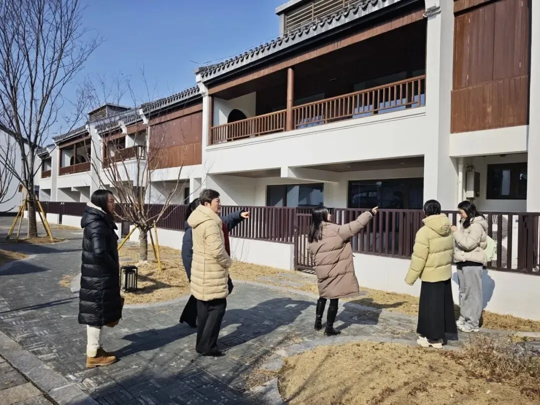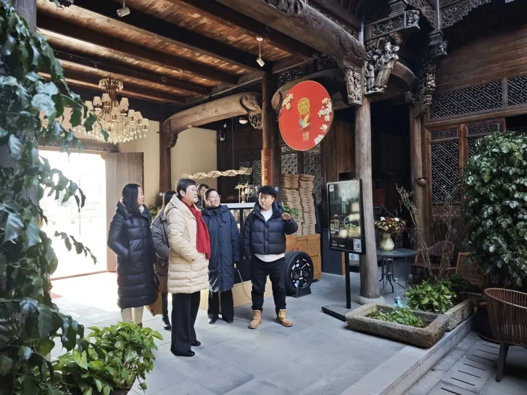 接着,调研团沿着蜿蜒的青石板路,开启了村内业态的深度探访,一步步走进港廊的烟火与诗意里。河岸的民宿群将江南建筑的温婉与现代舒适感相融,藏着古村独有的烟火松弛感。解元厅的飞檐翘角间承载着岁月沉淀,诉说着古村的人文风雅。