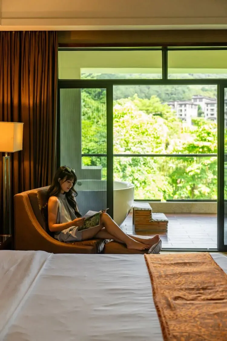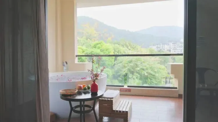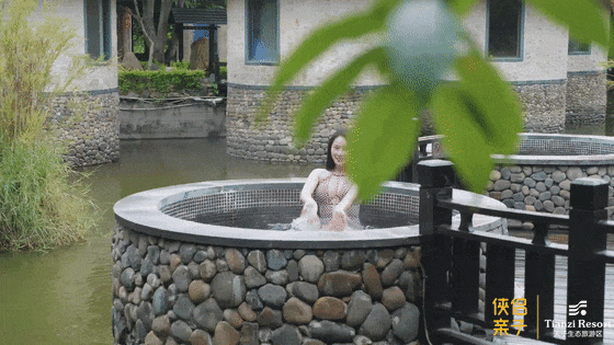 伴着日落月升,嗨玩一整天的你,多多少少会有疲惫之感,那就在房间泡个温泉,听潺潺流水、鸟莺虫鸣~