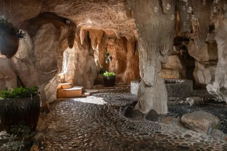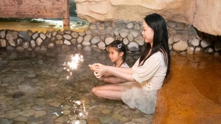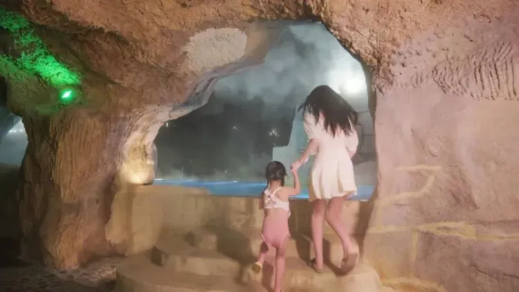 临湖的温泉汤池、暖橘色溶洞温泉....