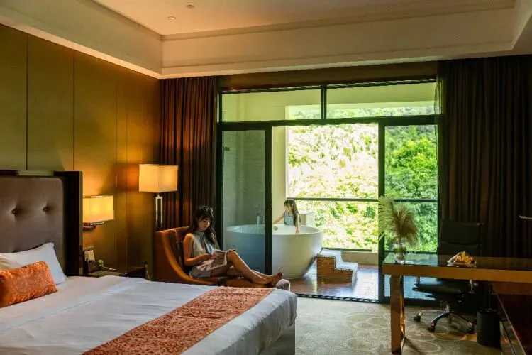 客房直供温泉水,就算是足不出门,也能享受美美的温泉浴,又或者在阳台上凭栏而望,看温泉美景,陶醉在这,人与自然和谐一体的大美意境中。