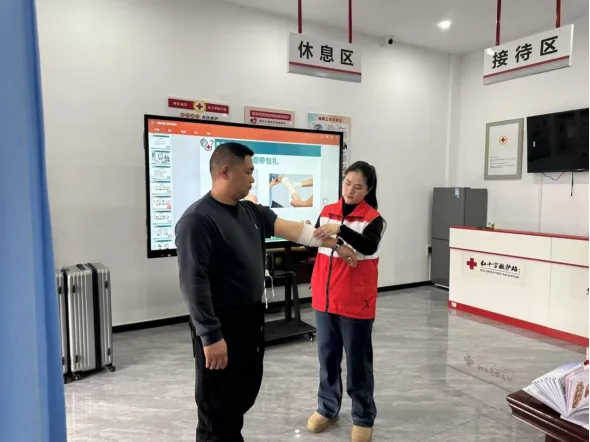 课堂上,学员们热情参与,全程专注聆听、认真记录,氛围热烈活跃。理论授课结束后,进入实操演练环节,讲师亲自示范标准动作,逐人指导纠错,确保每位学员都能掌握规范操作。学员两人一组默契配合,互相练习包扎技巧,在实践中巩固所学。课程最后进行专项考核,对学员的理论掌握程度与实操操作水平进行综合检验,考核合格的学员将统一颁发红十字救护员证,切实保障培训实效与学习成果。