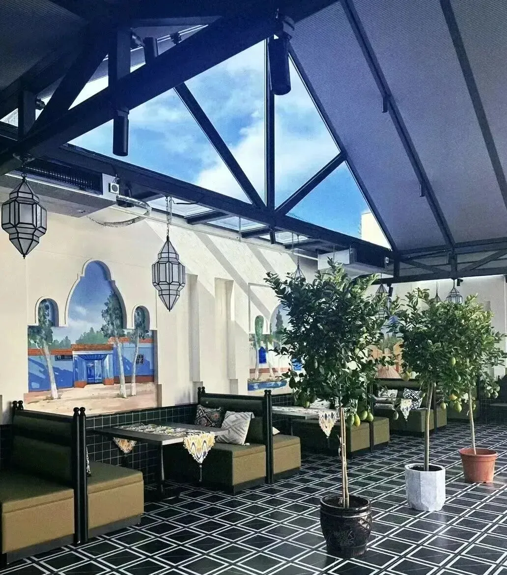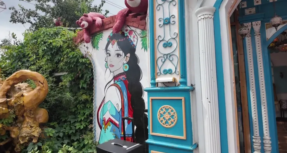 店内温馨舒适,装修风格鲜明,让人能感受到伊犁各族群众的热情。店外休闲风的桌椅、配着纯白色的围栏装饰、彩色的墙壁,闲适又惬意,成了六星街里的一处景观。