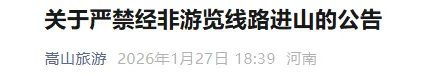 1月27日,“嵩山旅游”官方微信公众号发布《关于严禁经非游览线路进山的公告》。
