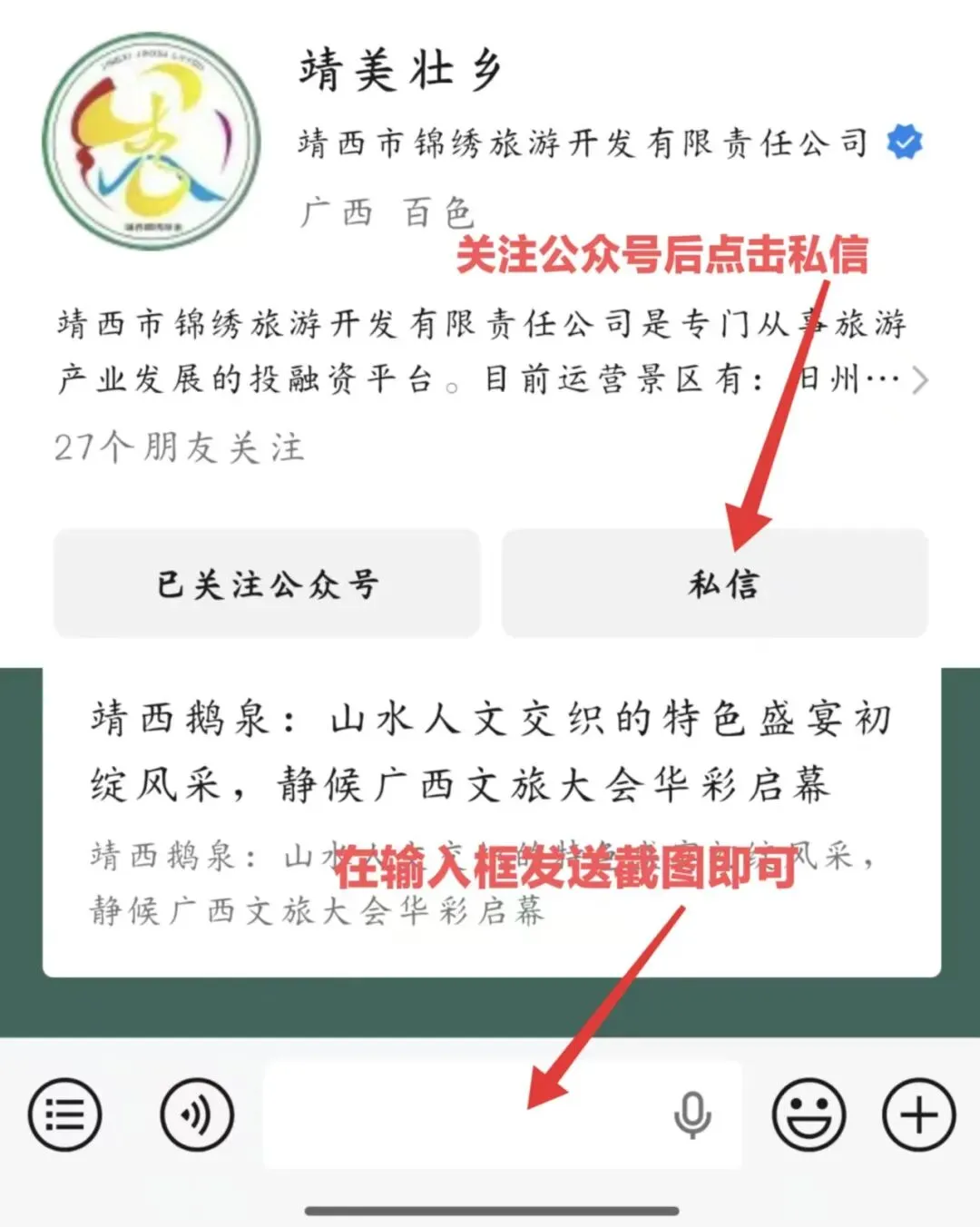 参与集赞活动的游客请将截图发送到微信公众号后台,会有工作人员统一登记。(截图发送操作如下图)