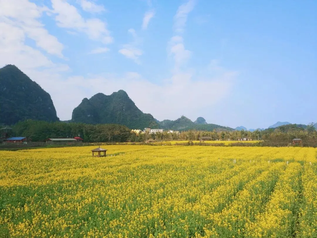 春节期间,旧州景区的油菜花海迎来盛花期,金黄的油菜花在阳光下闪耀着光芒,微风拂过,泛起层层金色的波浪,仿佛是大自然为远道而来的客人铺就的金色地毯,送上春日最美好的祝福。