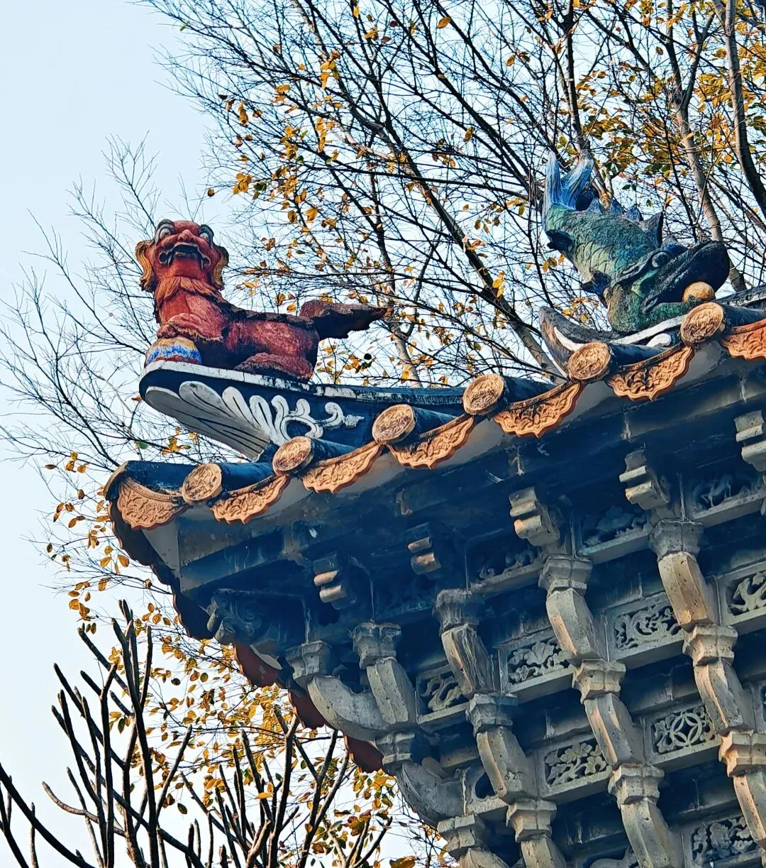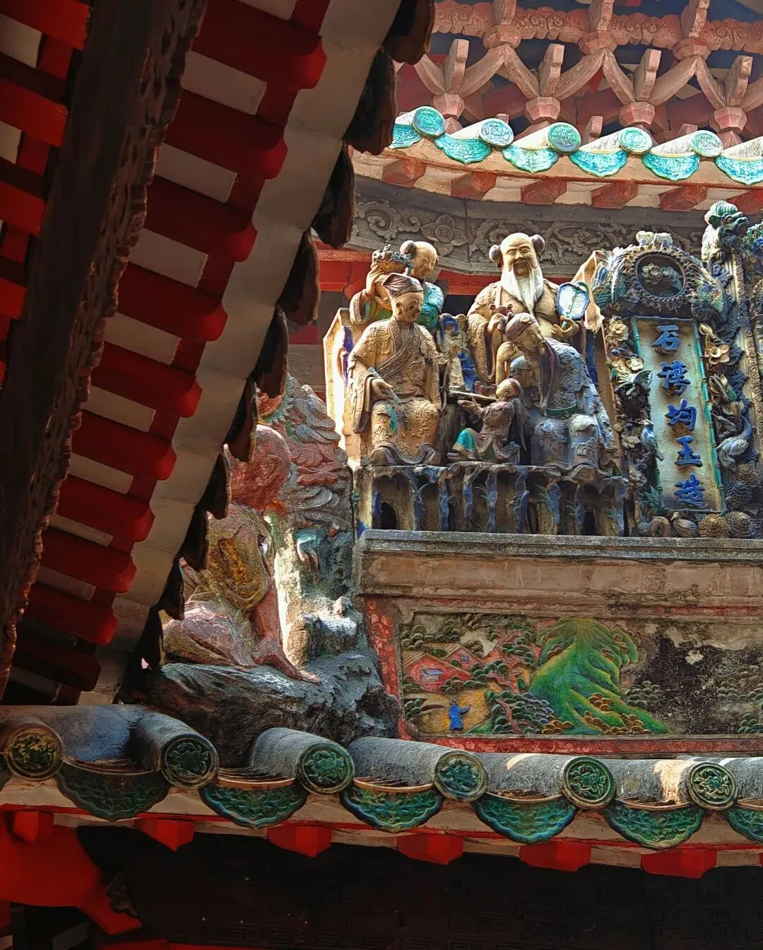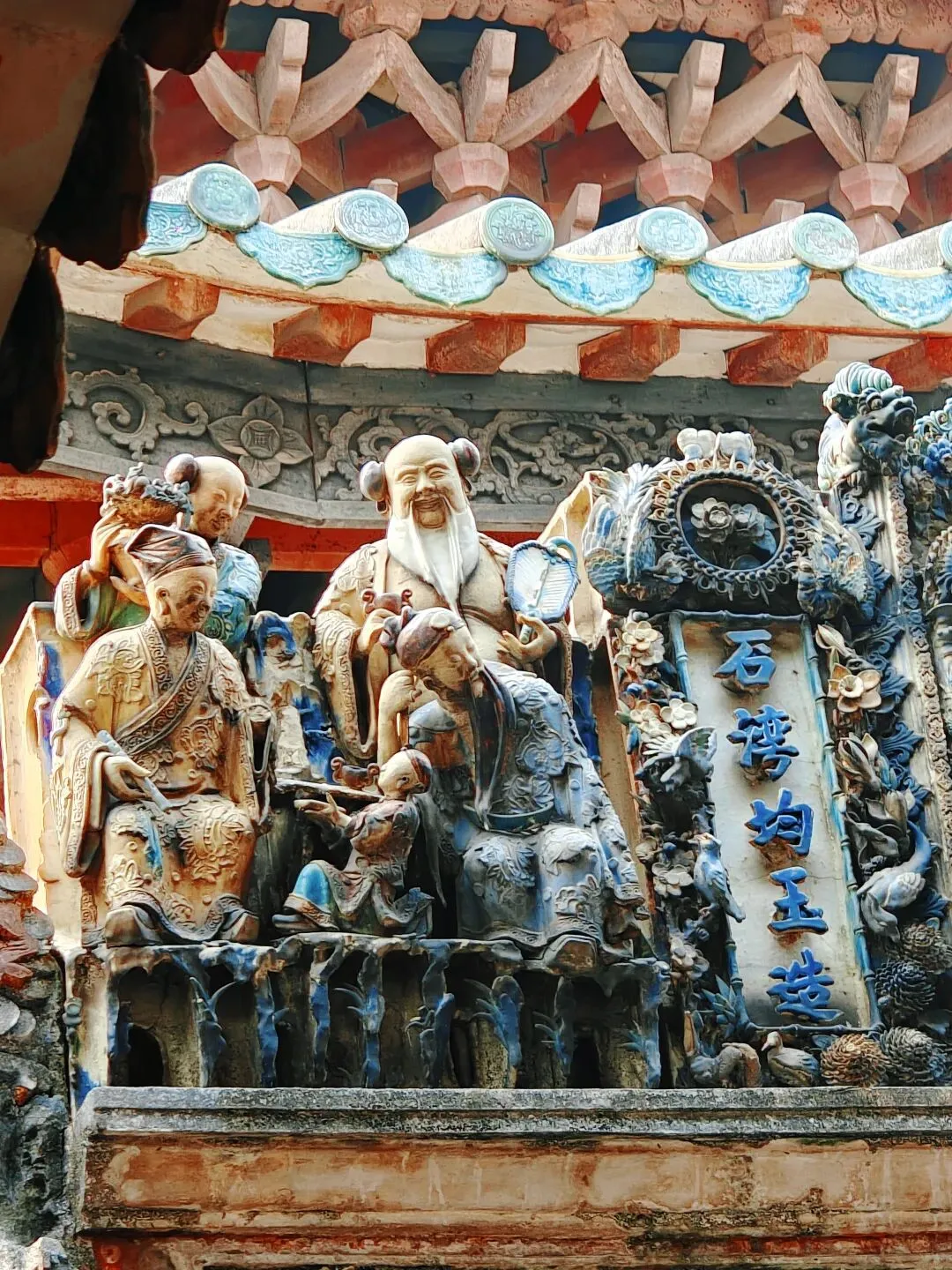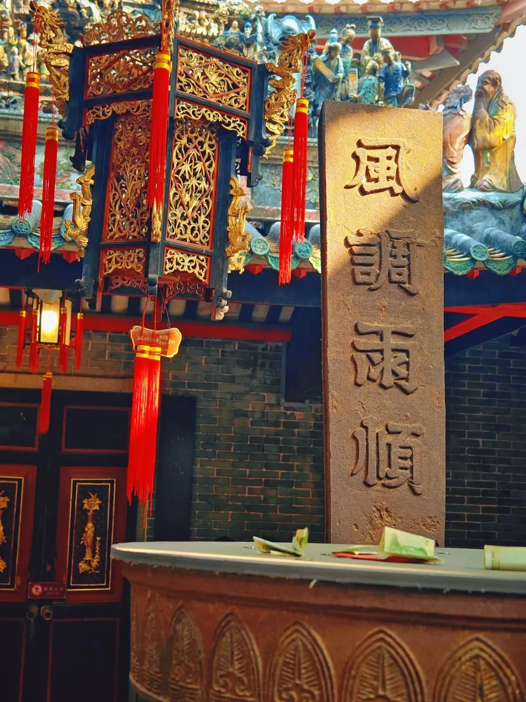 佛山祖庙,又名“北帝庙”、“灵应祠”,始建于北宋元丰年间,其结构严谨,装饰、陈设大多是本地生产,如石湾的瓦脊陶瓷、墙壁上的砖雕、殿堂里的木雕、以及锦香池中雄踞水面的龟蛇石雕等等。所塑造的各种故事人物、鸟兽花卉等,大都构思新奇,刻画细致。锦香池里的巨大石刻龟蛇,象征着真武大帝的原身,按照惯例,投了纸币许了愿。 喜欢拍瓦脊上的雕塑,色彩丰富,活灵活现。 “佛山祖庙是供奉道教崇信的北方玄天大帝的神庙,名“北帝庙”。之所以称为祖庙、是因为“历岁久远,且为佛山诸庙首”的缘故。同时,因为宋、元以后这里一直是佛山各宗祠公众议事的地方、成为联结各姓的纽带,所以佛山人习称它为祖庙。”'——百度百科