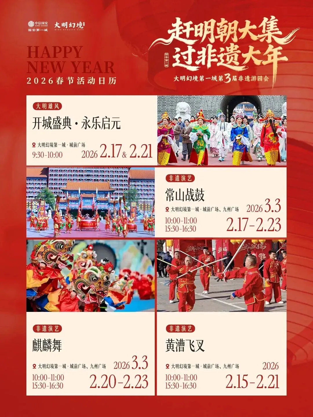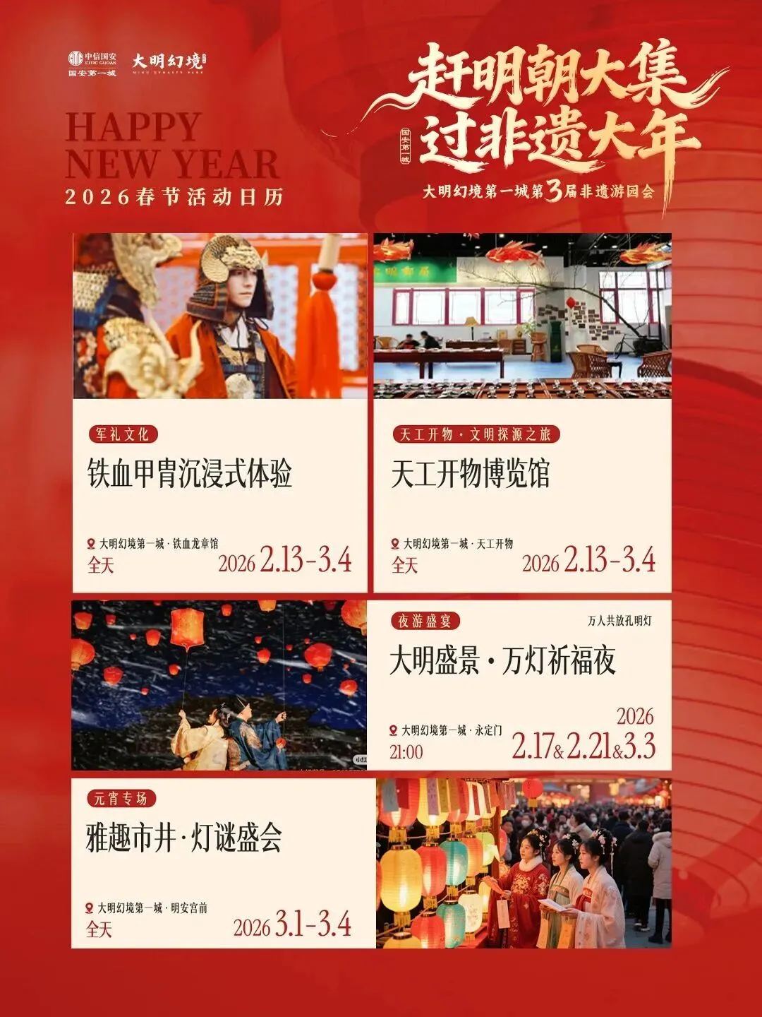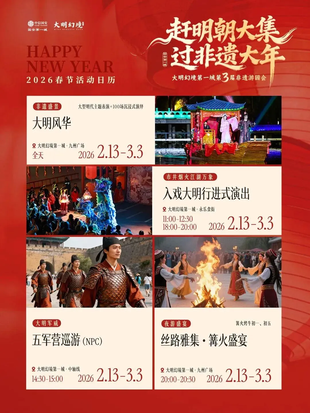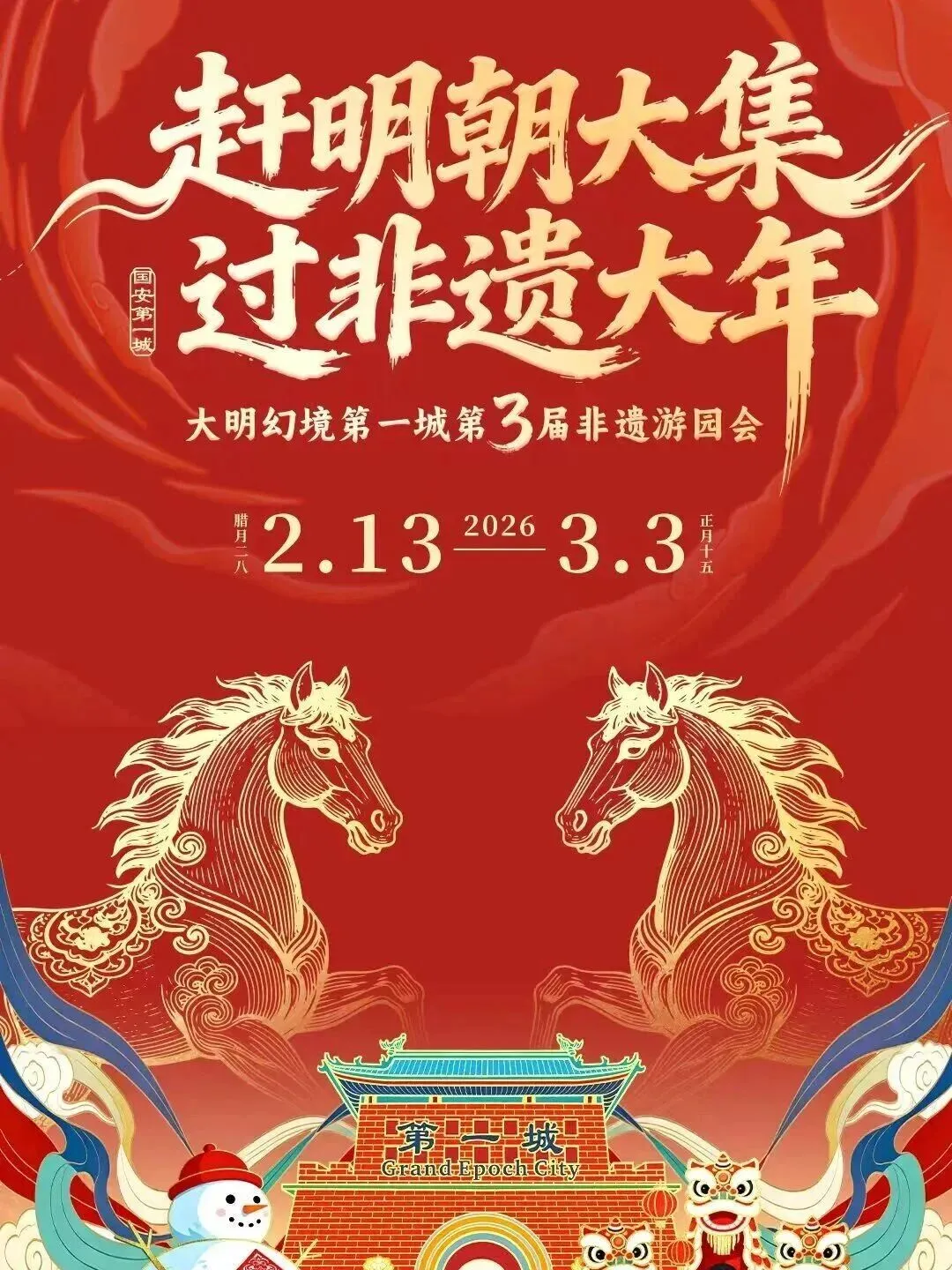 如果说其他地方是“过春节”,那大明幻境第一城就是“过明朝”。2026.2.13——3.4日,这里要办第三届“非遗游园会”,主题叫——“赶明朝大集,过非遗大年”。