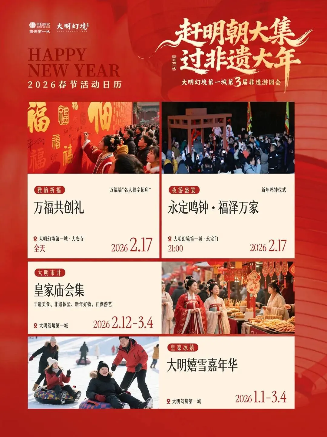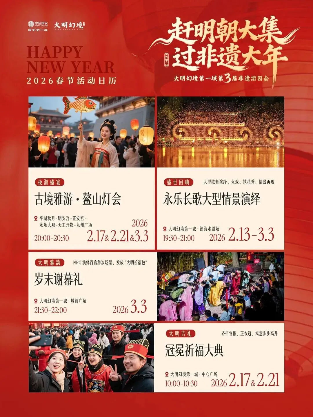 冠冕祈福大典(2.17/2.21)穿官服祈福,寓意步步高升;大明嬉雪嘉年华(1.1-3.4)雪圈、冰滑梯随便玩;
