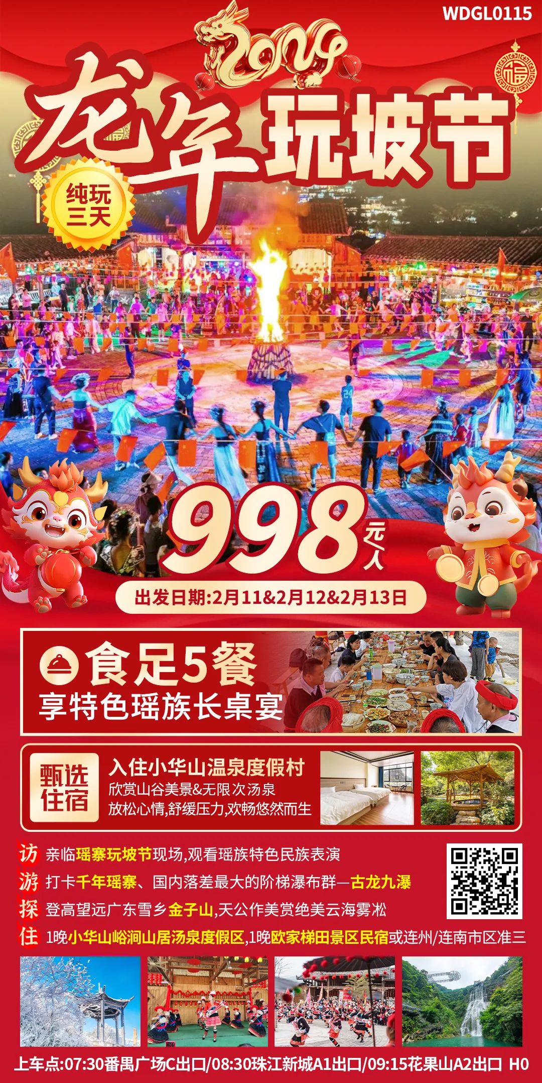 您现在的位置是:首页 > 国内旅游目的推荐 > 正文 国内旅游目的推荐 【跟团游】2月12日成团【龙年玩坡节三日游】亲临瑶寨玩坡节现场~打卡千年瑶寨、古龙九瀑!登高望远金子山,天公作美赏云海雾凇~ admin2024年02月08日 01:52:57国内旅游目的推荐134 ?2月12日铁发 余302月11日上客中 余432月13日上客中 余45¥998 龙年玩坡节三日游亲临瑶寨玩坡节现场#打卡千年瑶寨、古龙九瀑⛰登高望远#金子山,天公作美赏云海雾凇,吃足五餐#浸泡小华山峪涧山居无限次汤泉***部分图文来源于网络,如有侵权请联系我们删除***可添加客服微信详询 转载请说明来源于"旅荐网",部分内容转载自网络,如有侵权请联系qlwl@foxmail.com删除 本文地址:https://www.15386.cn/post/8870.html 上一篇 党员冬训“这厢有理”!度假区基层党员冬训理论骨干培训会举办 下一篇 【跟团游】早鸟计划【花样重庆】双动五天,广东成团,全程粤语导游!重磅升级2晚五星+1晚温泉酒店!重庆网红景点一网打尽~ 相关文章 游玩 文化和旅游部《旅游安全实务手册》(下) 张家界自由行攻略:90%的人不知道的“省钱省心”秘诀 太原8个热门旅游景点预约指南汇总!(2026年3月实时情况更新)轻松! 西安13个热门旅游景点预约指南汇总(2026年3月实时情况更新),1个景点记得提前预约! 第一次去新加坡旅游怎么玩?拒绝爆肝做新加坡攻略,这份比新加坡自由行还爽的行程请查收! 千岛湖2日躺平旅行不开车de美食拍照攻略 五一假期必去的8个小众旅行地,无需攻略,挑一个立马出发! 宁波旅行必读!宁波全攻略实用版(干货在手) 谁说旅行必须做攻略?在德阳街头随意Citywalk,才是打开春天的正确方式 发表评论 取消回复 评论列表 这篇文章还没有收到评论,赶紧来抢沙发吧~
