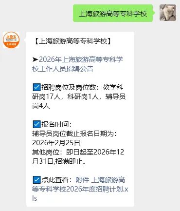 温馨提示:扫描下方二维码,进入【本地宝上海招聘】公众号,对话框回复关键词【上海旅游高等专科学校】可快速获取完整公告、报名方式。