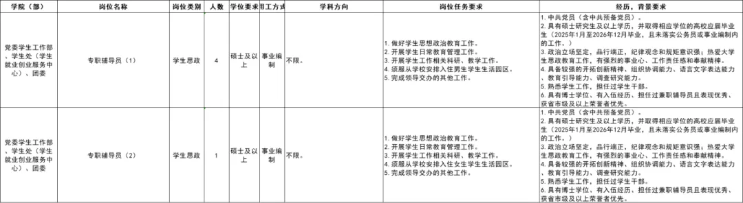 辅导员岗:承担大学生思想政治教育工作。中共党员(含中共预备党员),热爱学生工作,具备较强的组织协调与沟通表达能力,能胜任辅导员岗位的工作要求。