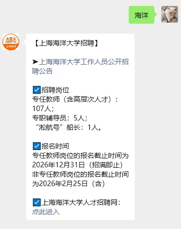 应聘者根据上海海洋大学人才招聘网公布的岗位相关要求,网上填报信息。专任教师岗位的报名截止时间为2026年12月31日(招满即止),非专任教师岗位的报名截止时间为2026年2月25日(含)。