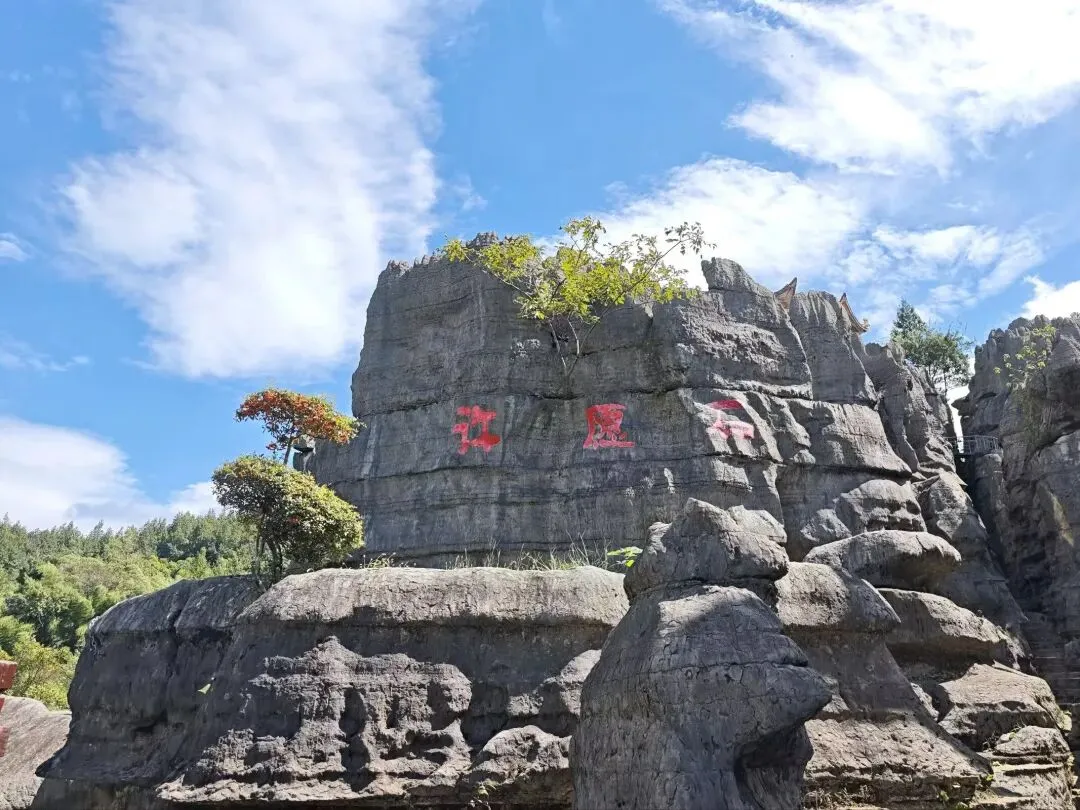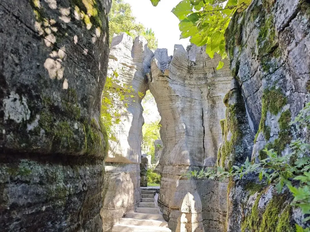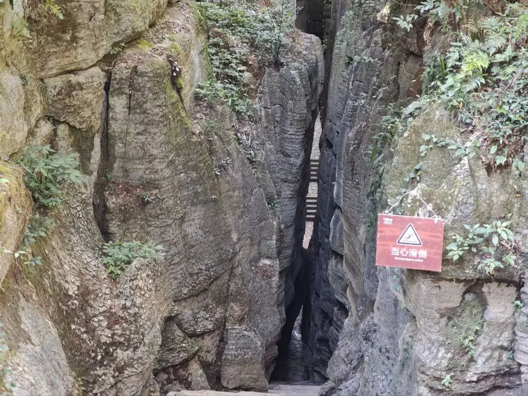 景区属喀斯特地质公园,兼具石林、溶洞、瀑布等景观,分布石扇、石塔、化石群等地质遗迹,尤以天门洞、一线天、香炉山最具代表性。天门洞内石钟乳如流云石瀑,一线天为长达300米的狭长石缝,阳光倾泻形成独特光影。地层中保存寒武纪角石化石,包含珠角石等珍稀品种。