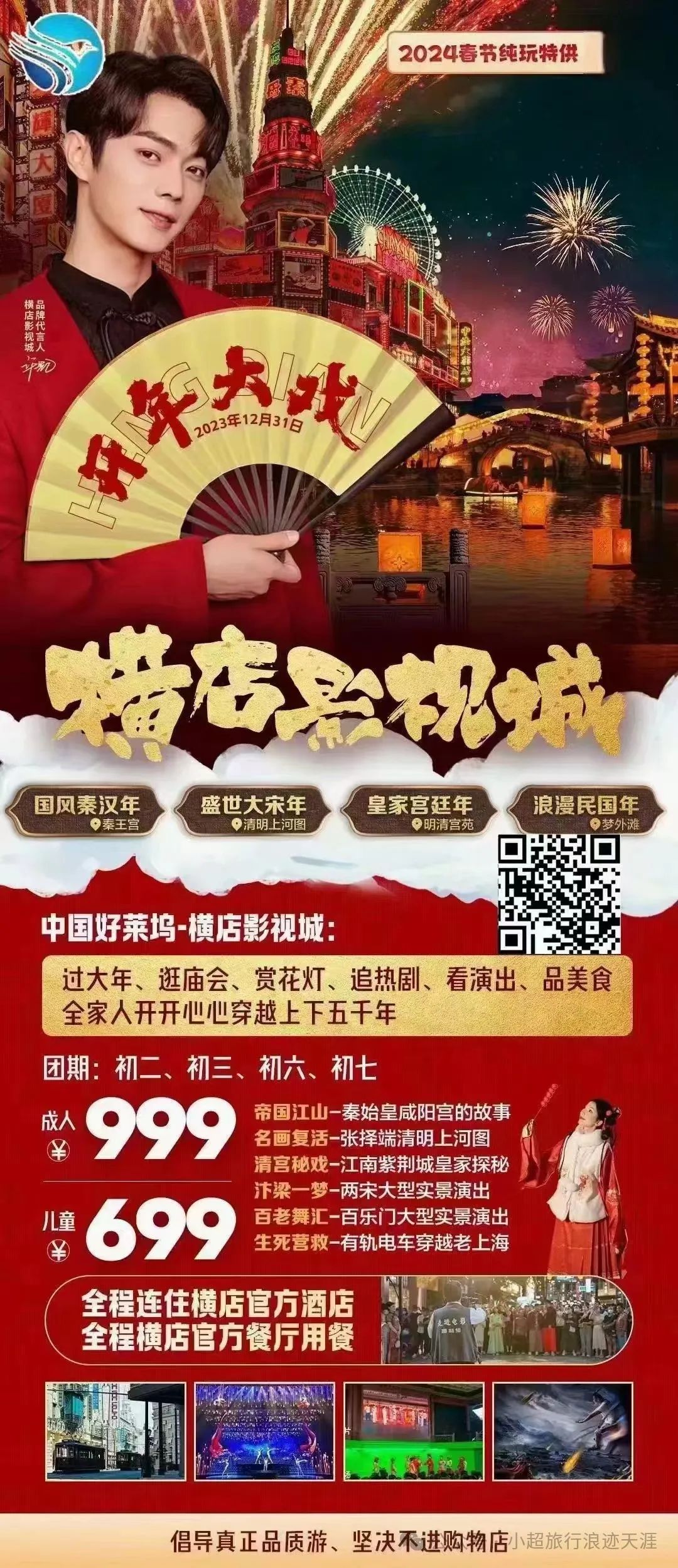 1、【我去横店过大年】横店影视城过大年+逛庙会+赏花灯+看演出+品美食大巴四日游 2月11号发团