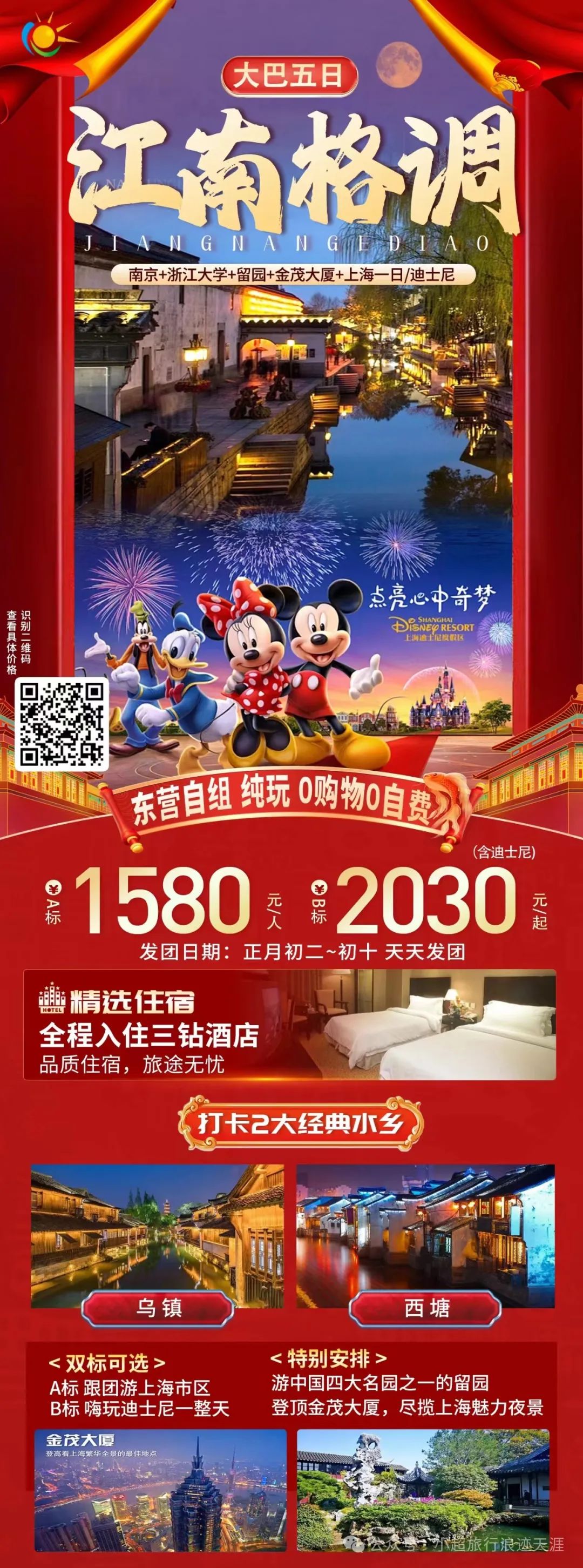 5、【江南格调】南京+浙江大学+西塘+乌镇+留园+金茂大厦+上海一日/迪士尼大巴五日游 2月11/13号发团