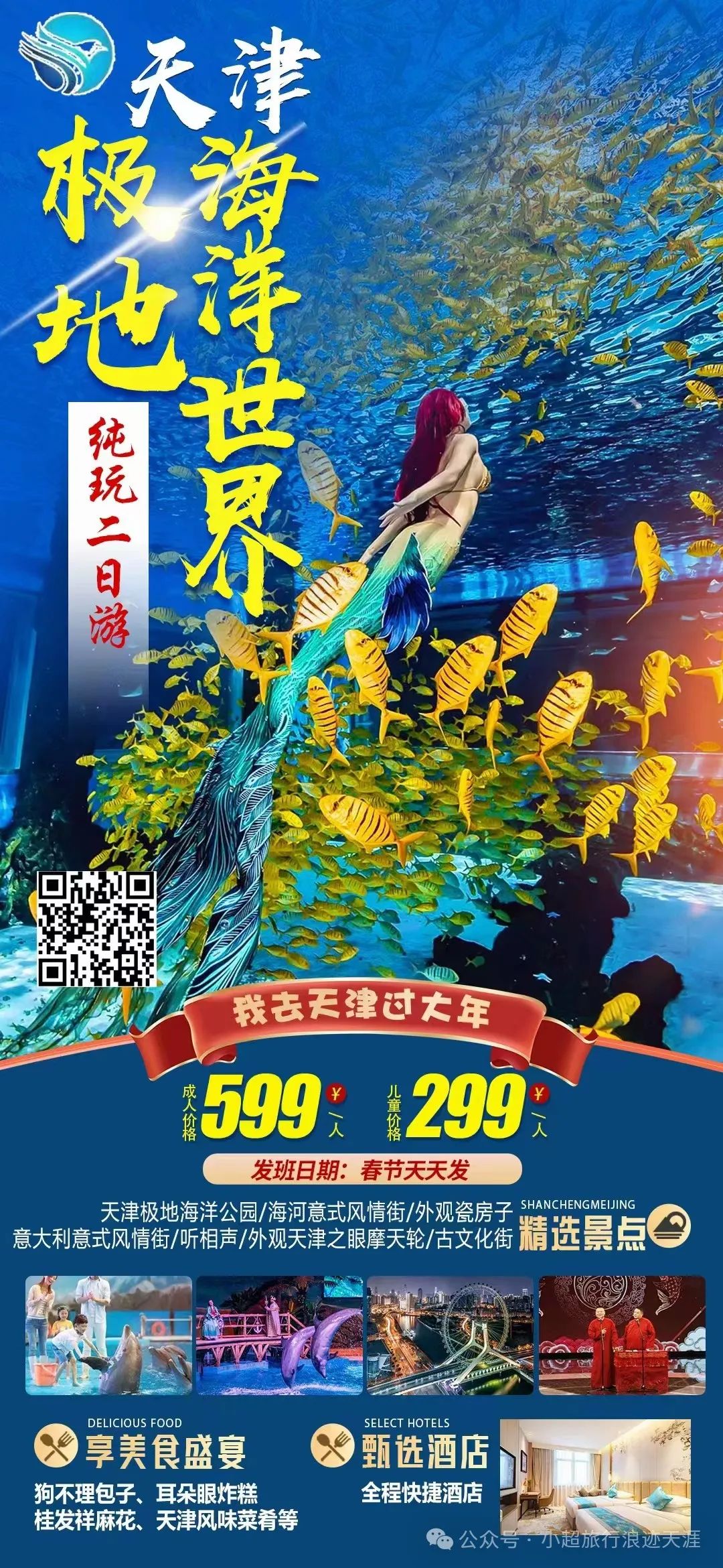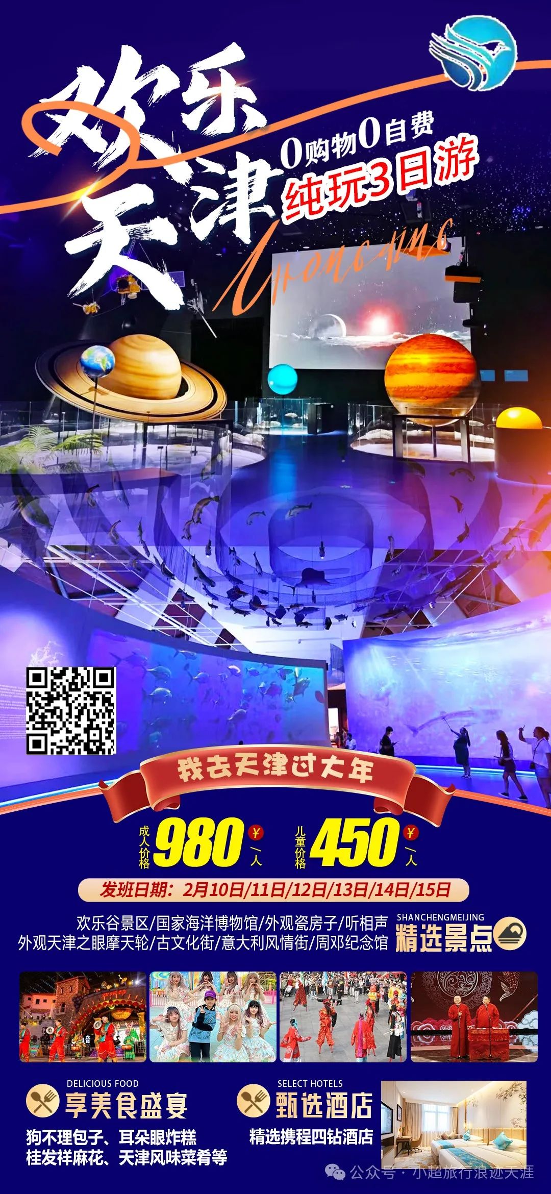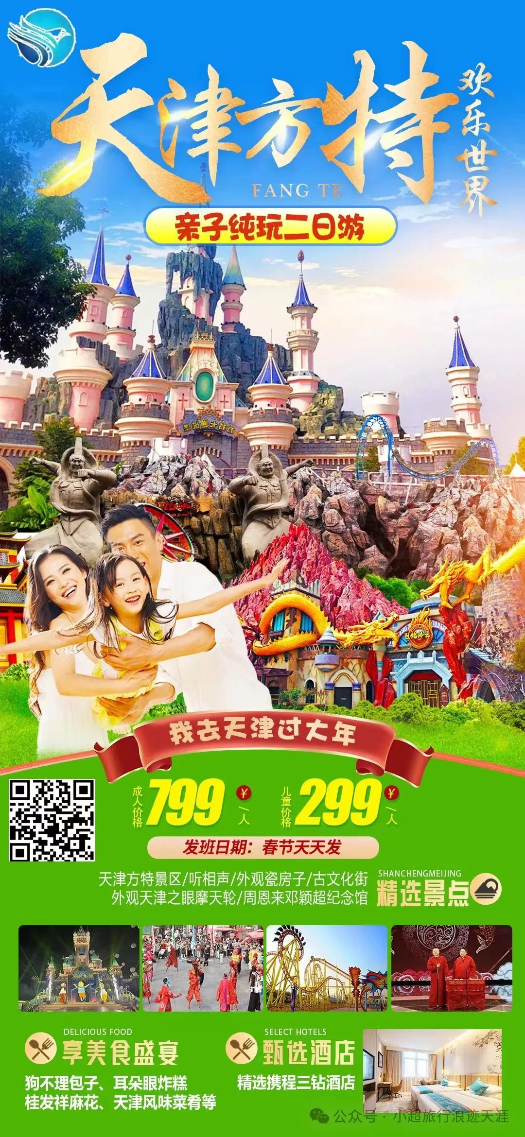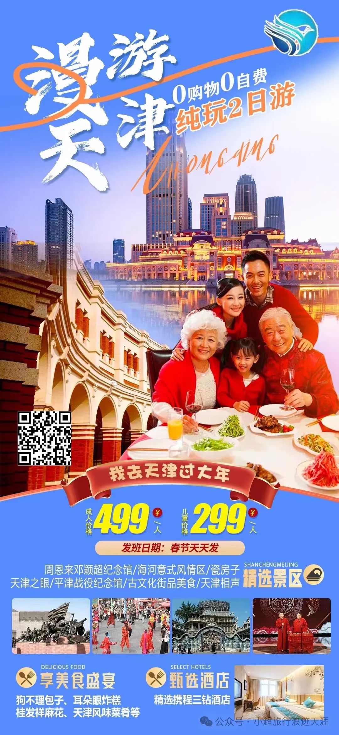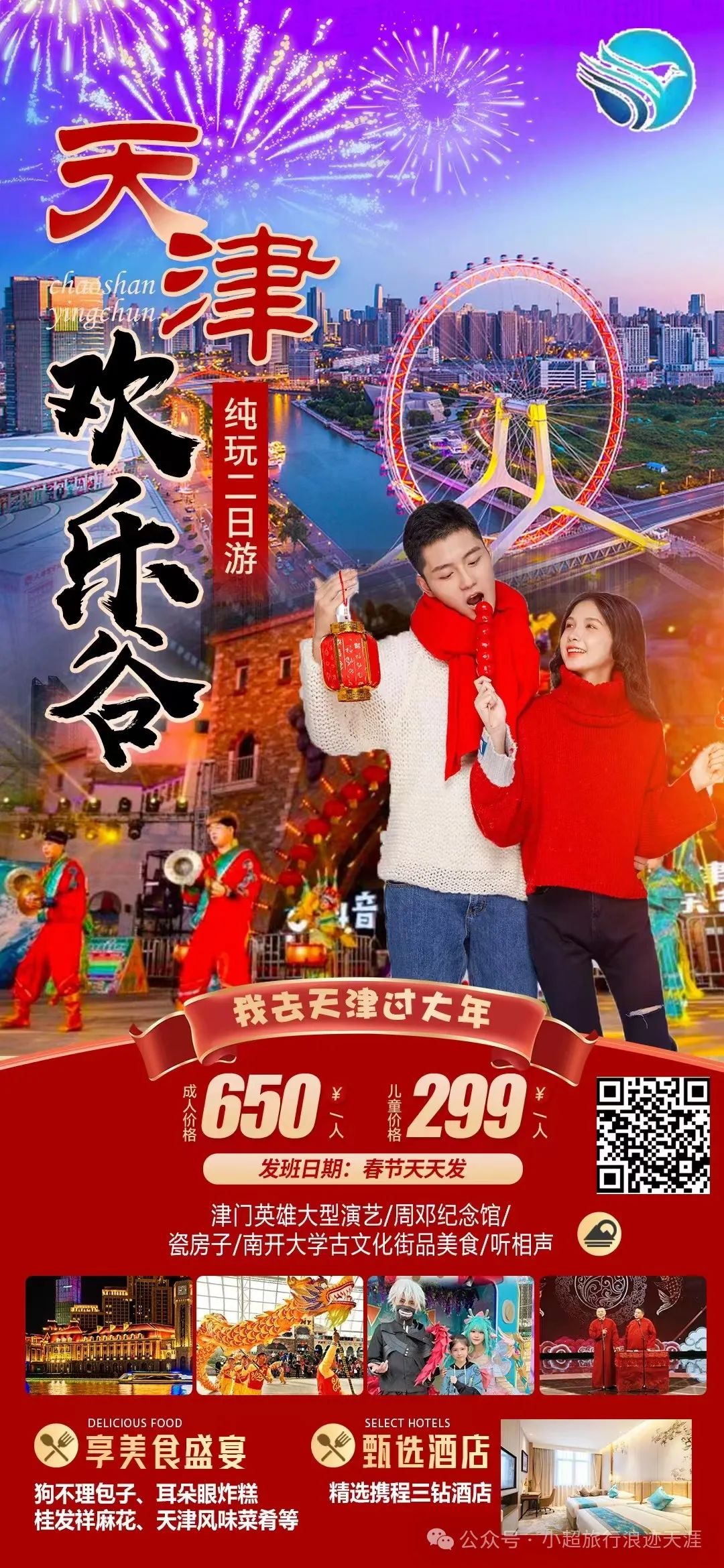 1、我去天津过大年【欢乐天津】高端天津亲子天津欢乐谷(白+黑)+津门英雄大型演出+国家海洋博物馆+瓷房子+古文化街+意大利风情街+特色相声周邓纪念馆纯玩三日游 2月10号发团