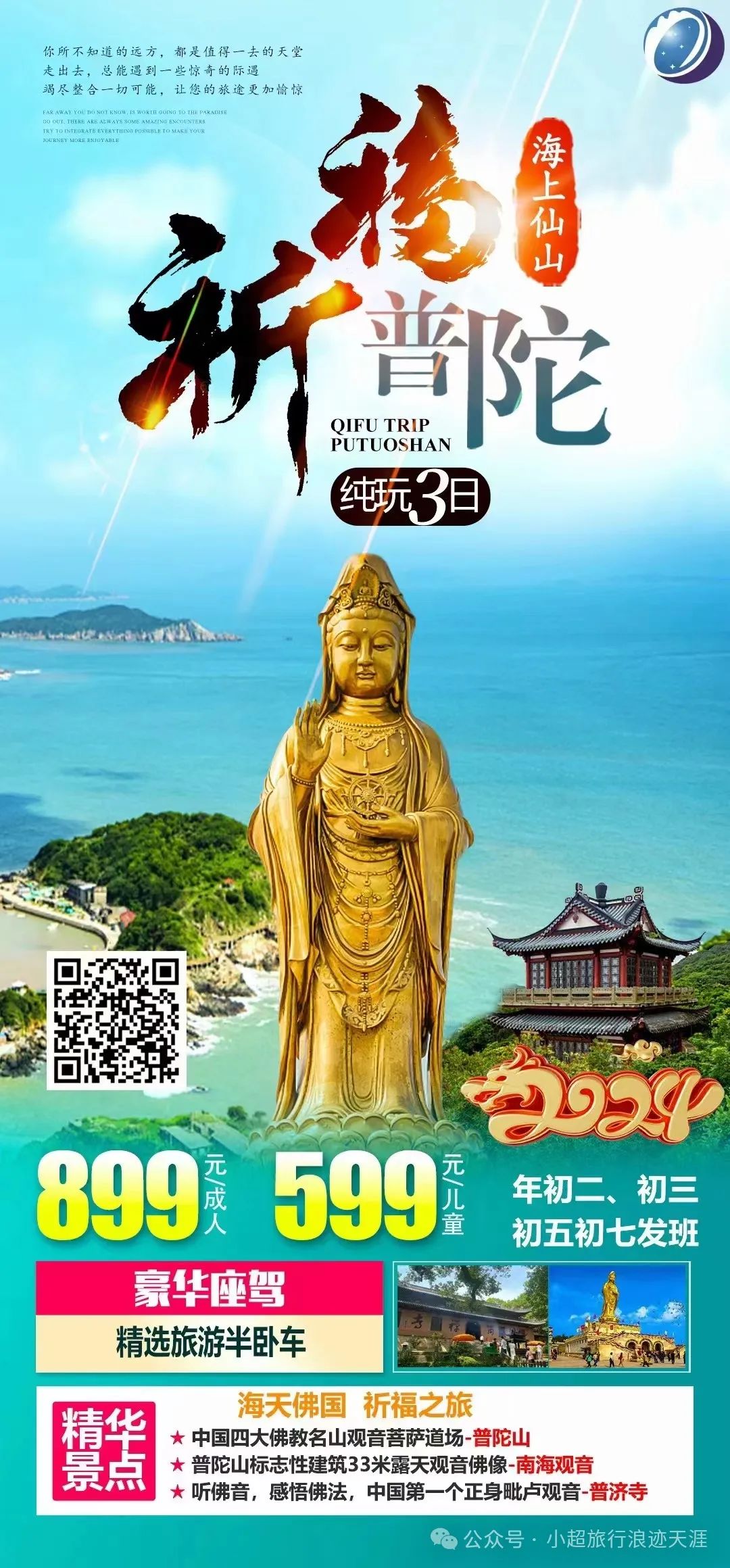 15、海上仙山、普陀祈福—南海观音、普济禅寺、不肯去观音院祈福三日游 2月14号发团(60周岁以上优惠80元,70周岁以上优惠160元)