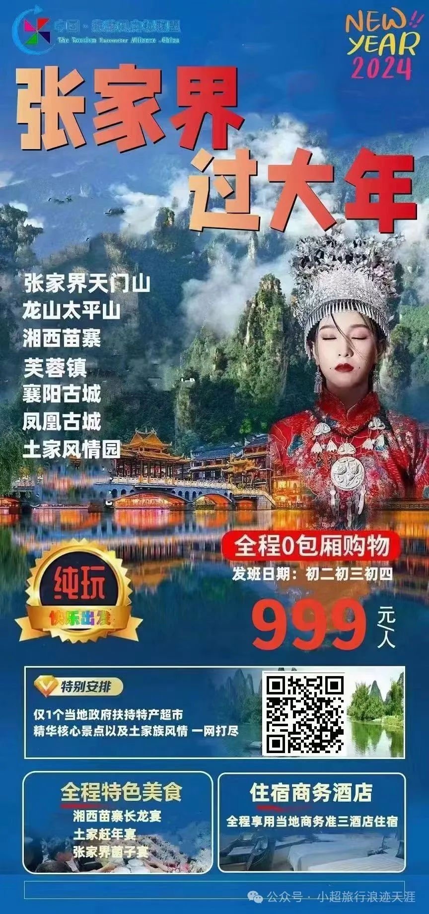 1、【张家界过大年】天门山、太平山、凤凰古城、湘西苗寨、芙蓉镇、张家界大巴纯玩六日游 2月11号发团