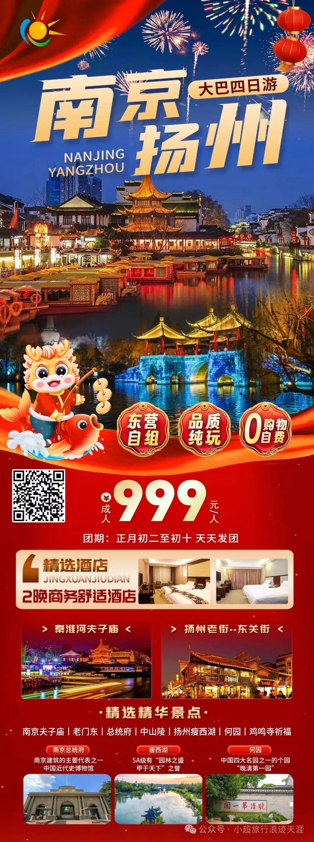8、【南京+扬州】南京夫子庙、老门东、总统府、中山陵+扬州瘦西湖+何园大巴四日游 2月11号