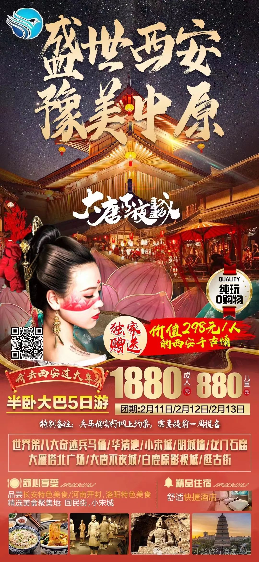 1、我去西安过大年半卧【盛世西安 豫美中原】世界第八大奇迹兵马俑+华清池+小宋城+明城墙+龙门石窟+大雁塔北广场+大唐不夜城+白鹿原影视城+逛古街+品美食纯玩五日游 2月16号发团