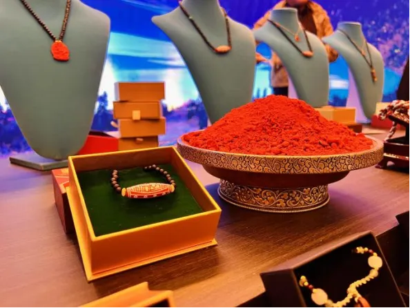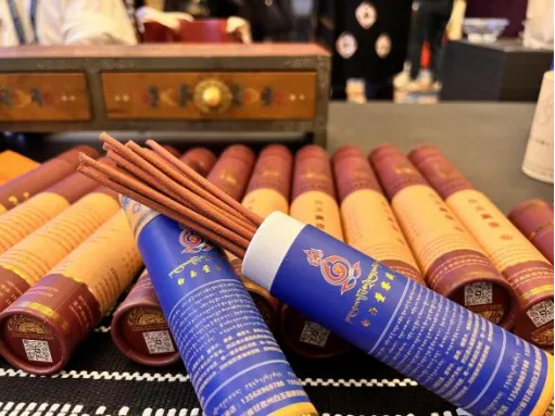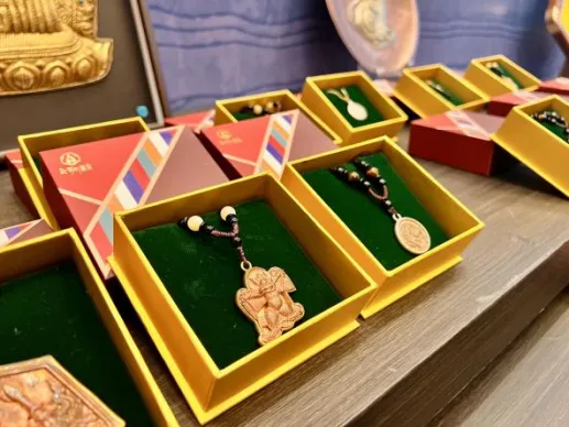 在众多展品中,德格印经院朱砂系列产品“德格朱墨珍宝”,因其独特的原料与工艺背景而备受关注。据介绍,其核心原料来源于德格印经院珍藏古籍木刻版在长期使用中自然积淀的朱墨沉积,结合了本地特有的矿物颜料、天然宝石粉末以及传统工艺配方,经复杂工序精制而成。由此开发出的擦擦佛像、财宝红天珠、珠宝饰品等系列衍生产品,不仅是精美的工艺品,也承载着独特的地方文化记忆与历史信息,体现了对传统技艺的创造性转化。
