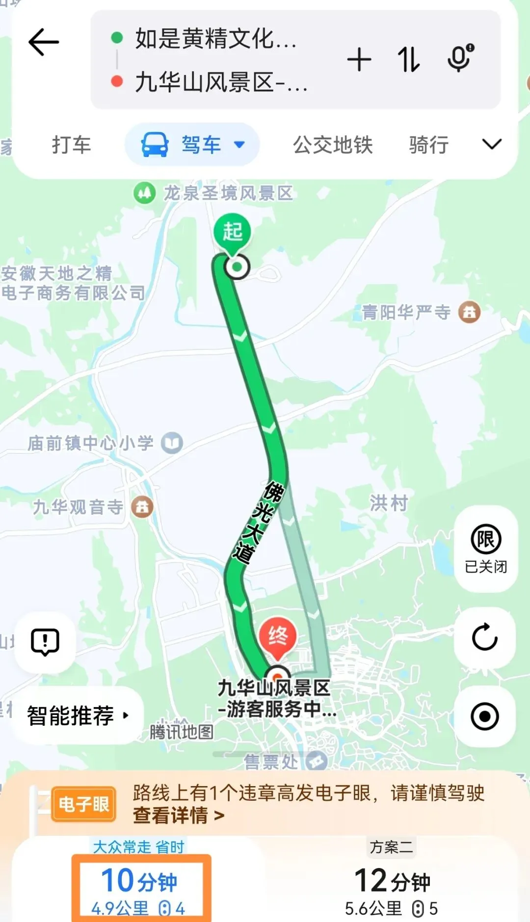 👉从上图看,酒店距离九华山游客服务中心4.9公里,车程10分钟,打车大约9元左右。