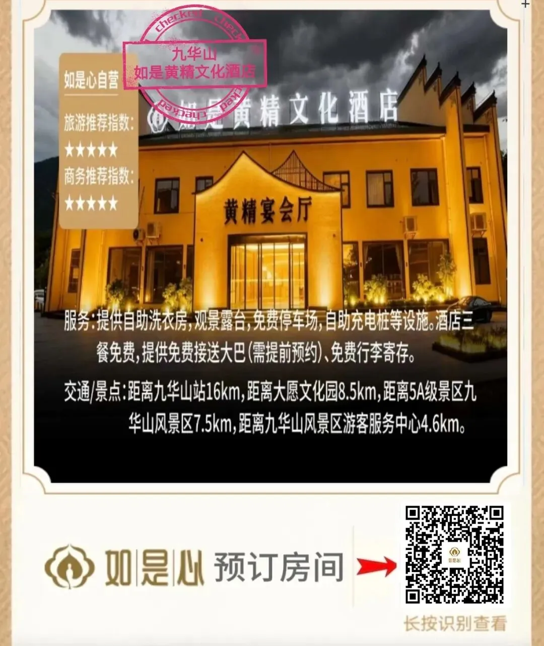 点击九华山如是黄精文化酒店图片,长按识别图片右下角订房二维码,授权登录完整服务,进入酒店订房的页面。(也可保存图片,用微信扫一扫打开)