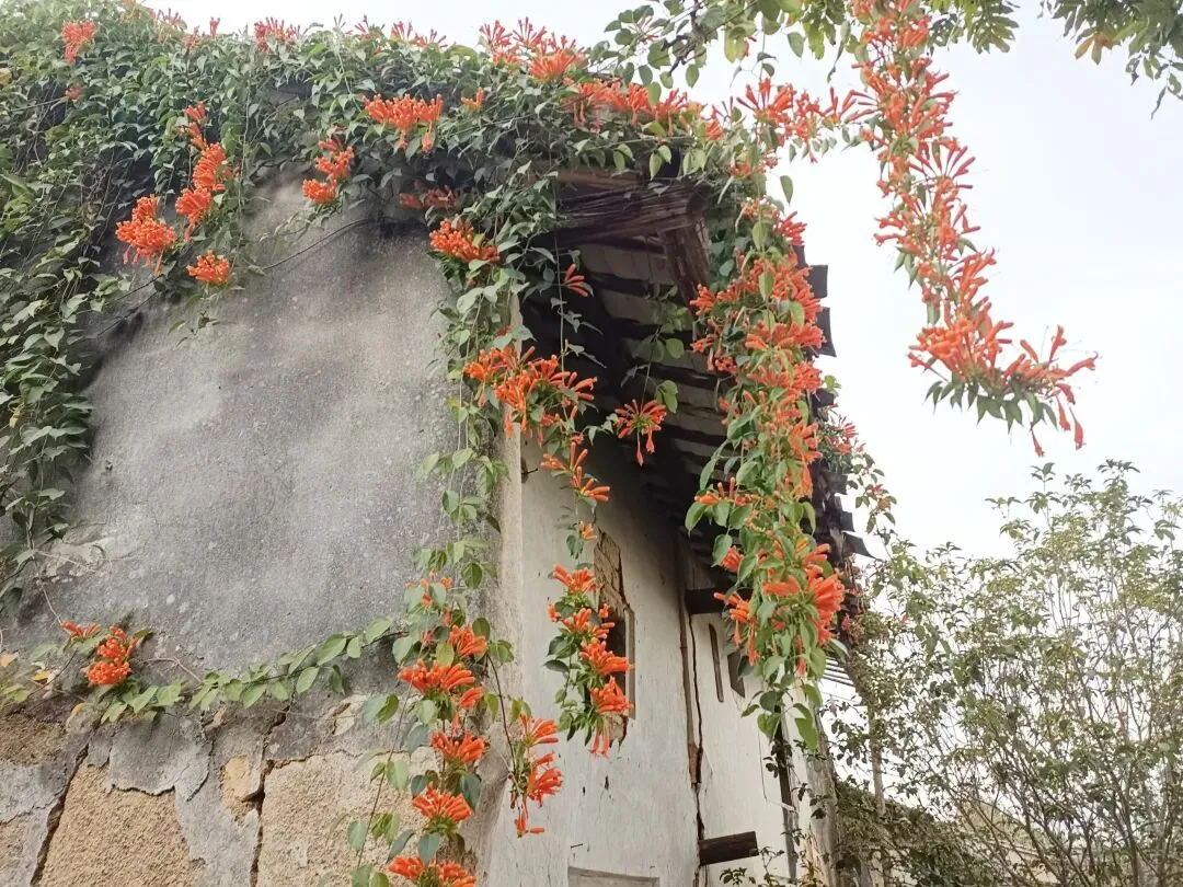 当我来到月湄村时,给我最震撼的是:一间破旧的老屋,屋顶竟然,满是红彤彤的炮仗花。