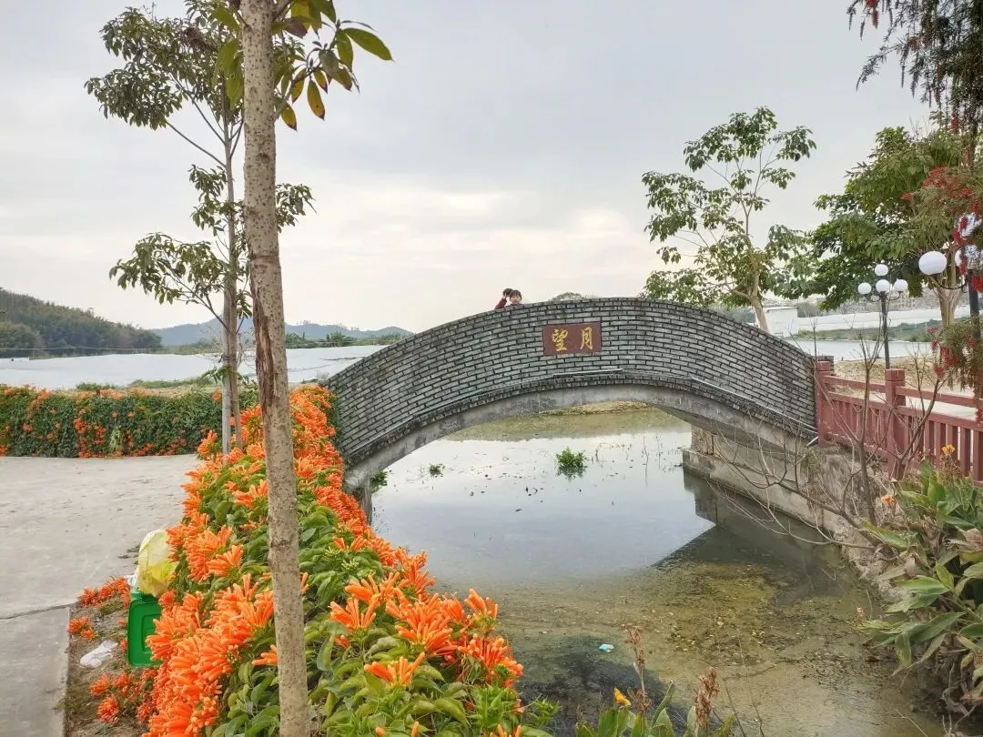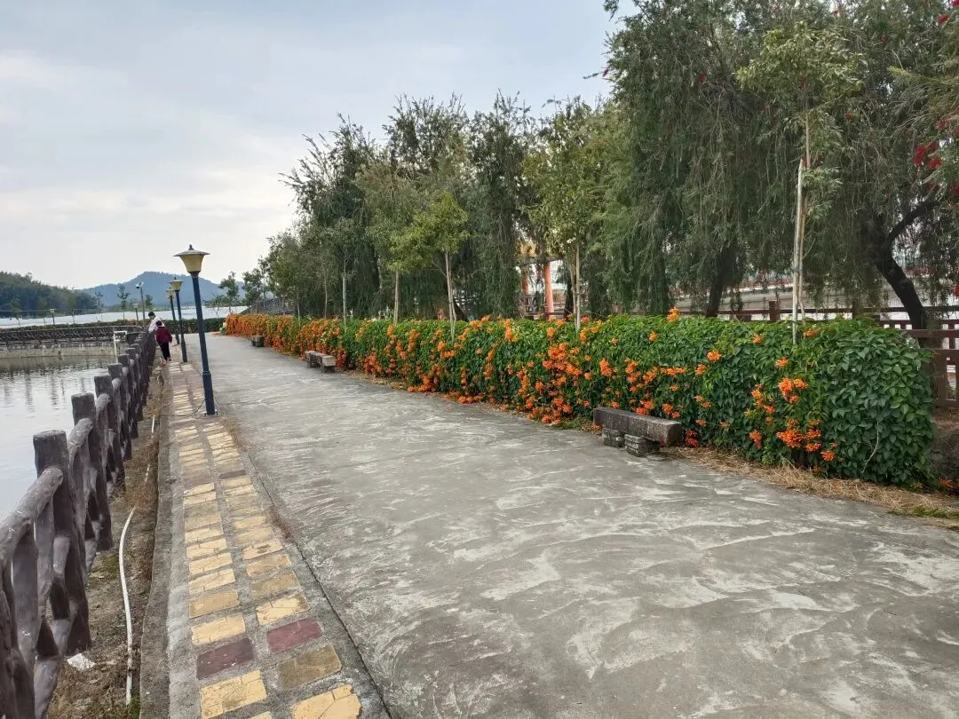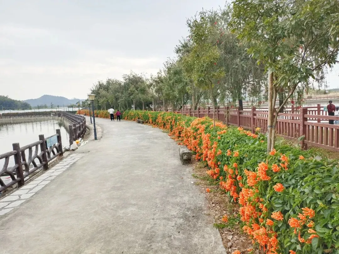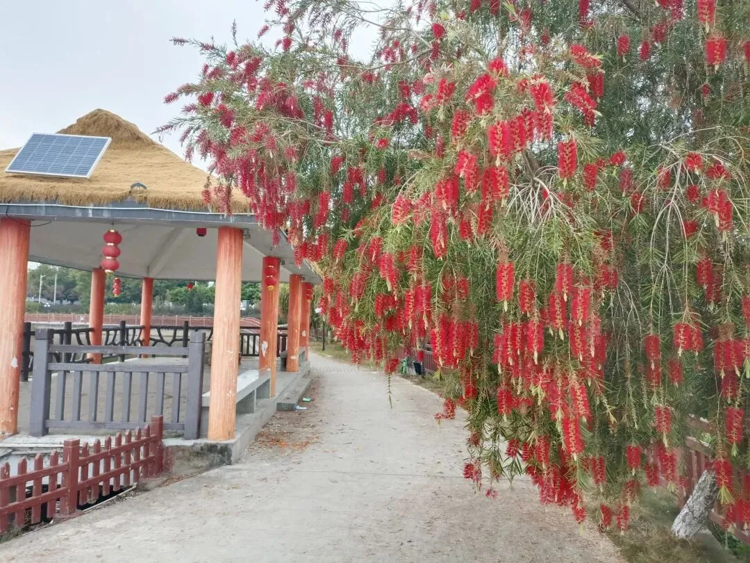 你看,这些垂下的红花,多像一串串红灯笼。 2012年5月,月湄村入选第三批广东省历史文化名镇名村。这里,春天,可以欣赏如画的黄花风铃木;夏天,可以在灯火璀璨的湖边散步。