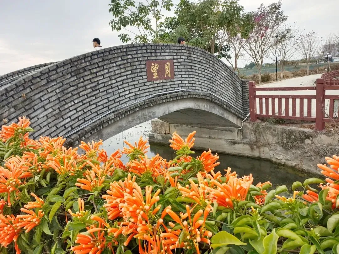 目前,这里的炮仗花,还没有达到最旺的时候,但是,也是挺好看的。特别,在一座叫“望月”的桥边,拍起照来,感觉很有意境。