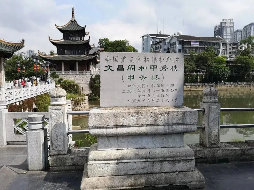 甲秀楼,位于贵州省贵阳市南明区翠微巷8号,坐落在南明河中的鳌矶石上,是贵阳历史的见证与文化发展的标志。该楼始建于明万历二十六年(公元1598年),由时任贵州巡抚江东之、巡按应朝卿倡建,取“科甲挺秀”之意,寄望于兴学育才,改变贵州人才稀少的局面。