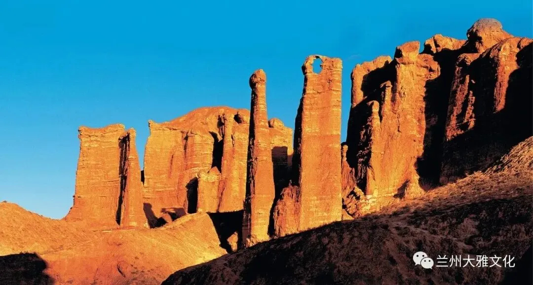 冰沟丹霞以砂岩地貌遗迹景观为主体,是国内窗棂状宫殿发育最好、规模最大的地质地貌遗迹,是““窗棂状宫殿式丹霞”地质命名地,被评为“窗棂状宫殿式丹霞地貌中国第一”。景区内广泛分布丹霞崖壁、石墙、石柱、尖峰、丘陵等地貌形态,尖峭挺拔,连绵不断,气势宏伟。