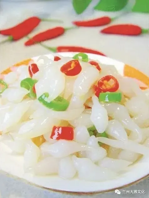 鱼儿粉多与浆水一起合食,尤其是夏天吃一碗鱼儿粉,借着浆水的酸爽和鱼儿粉的润滑,顿时一股清凉就传遍全身。鱼儿粉主要用精细的大豆粉制作,形状像小鱼,颜色有白有红,配上调料、小菜,活像一条条小鱼在碗里,故名鱼儿粉,是高台有名的传统小吃。