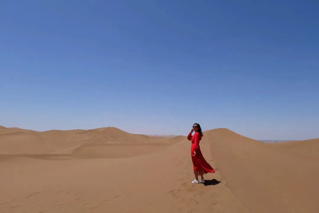 沙漠中,一袭红裙在漫漫黄沙中很亮眼