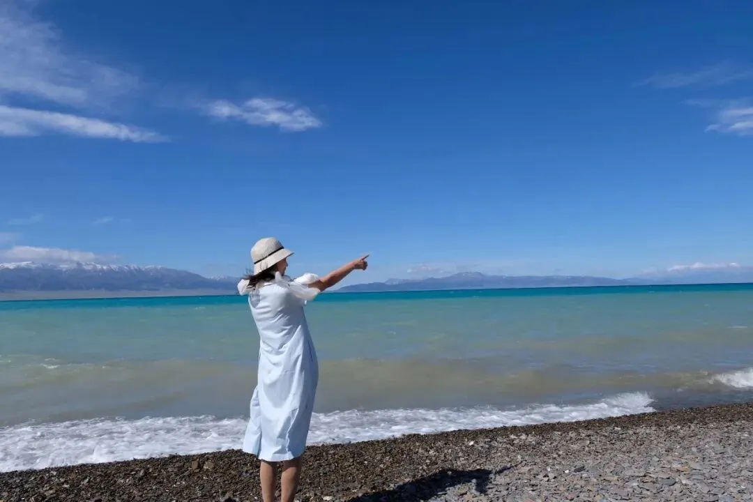 新疆赛里木湖,淡蓝色的连衣裙,和湛蓝的天空、碧蓝的湖水非常协调